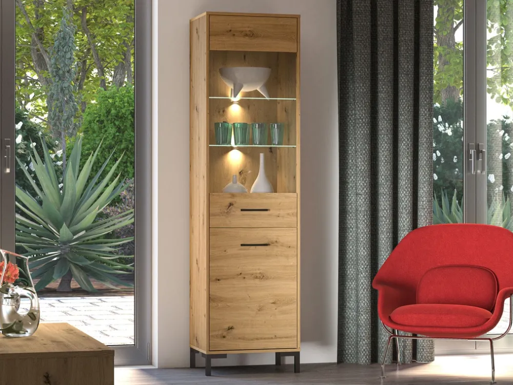 - Przeszklona witryna do salonu NEVIO o wysokości 200 cm wykonana z płyty laminowanej, krawędzie dodatkowo zabezpieczone okleiną ABS. Nóżki i uchwyty wykonane z tworzywa sztucznego w kolorze czarnym. Możliwe dokupienie oświetlenia LED do witryny.