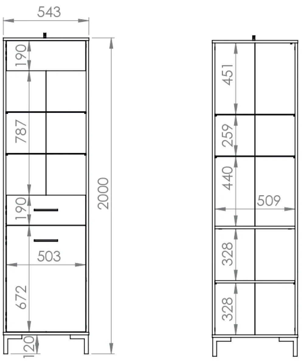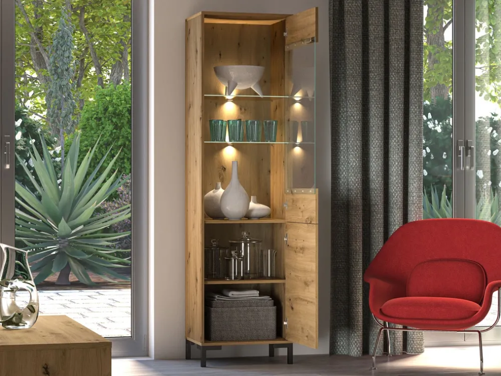 Wewnątrz witryny znajdziemy cztery półki, które zapewniają mnóstwo miejsca do przechowywania i eksponowania przedmiotów. Dwie z tych półek wykonane są ze szkła, co dodaje całości lekkości i nowoczesnego wyglądu. Szklane półki idealnie nadają się do eksponowania ozdobnych przedmiotów, książek czy kolekcji, które chcesz wyróżnić i podkreślić.