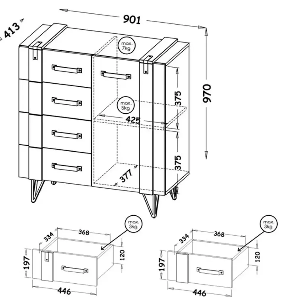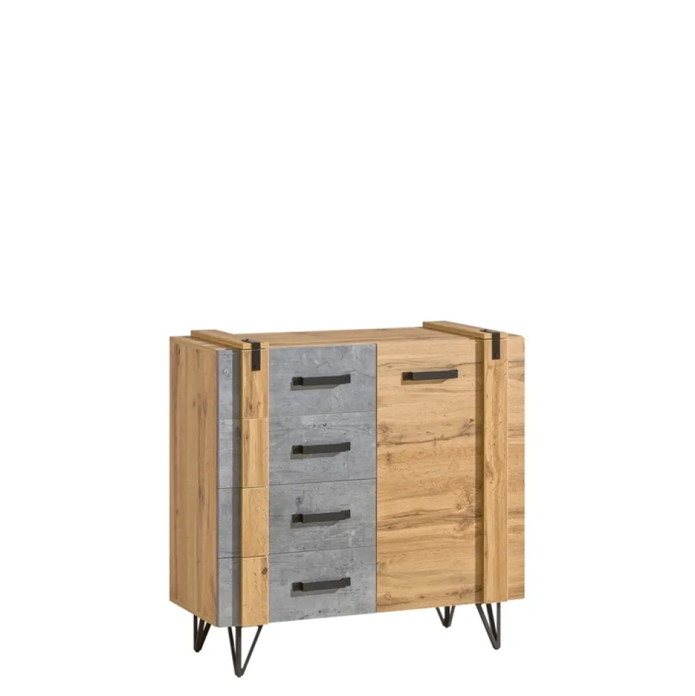 Komoda z szufladami osadzona jest na wysokich, metalowych nóżkach, które dodają jej lekkości i subtelnej elegancji. Wykonane z wytrzymałego metalu, gwarantują stabilność i trwałość, pozwalając jednocześnie podkreślić nowoczesny, industrialny charakter wnętrza.