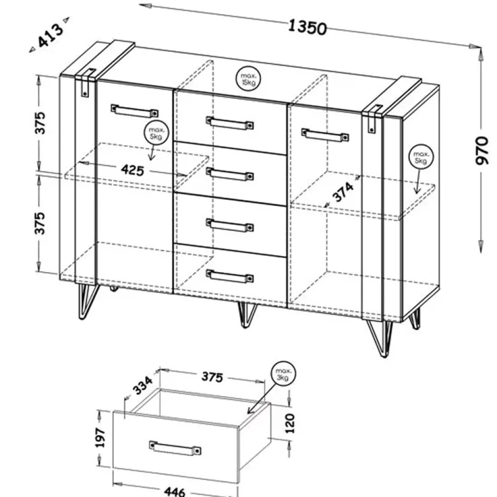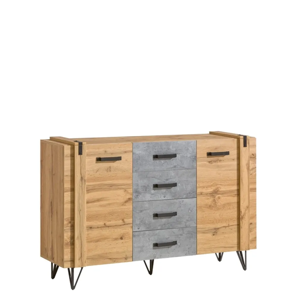 - Komoda do salonu LOSTI została wykonana w nowoczesnej stylistyce, razem z którą doskonale wpisuje się we współczesne aranżacje pomieszczeń. Komoda posiada cztery pojemne szuflady w swojej centralnej części oraz drzwi po prawej i lewej stronie.