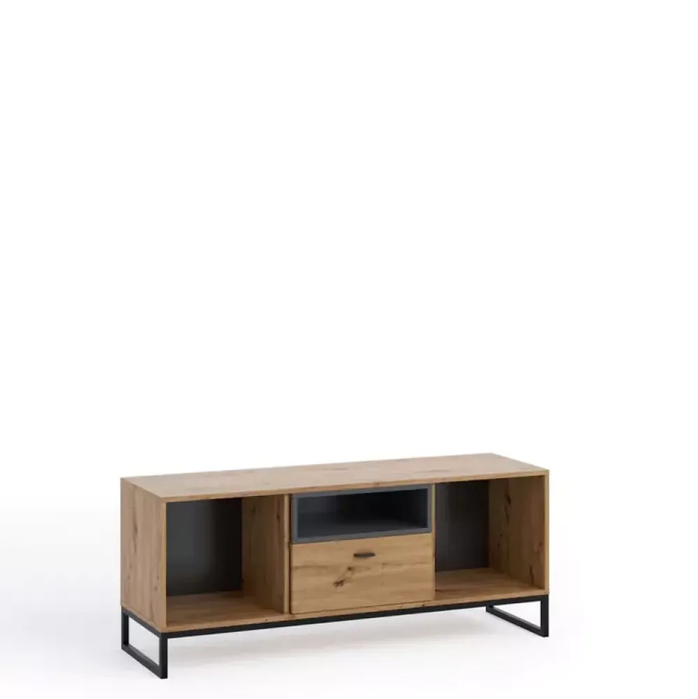 Szafka RTV o szerokości 135 cm wyposażona została w dwie zamykane szafki uchylne oraz jedna szufladę i półkę.