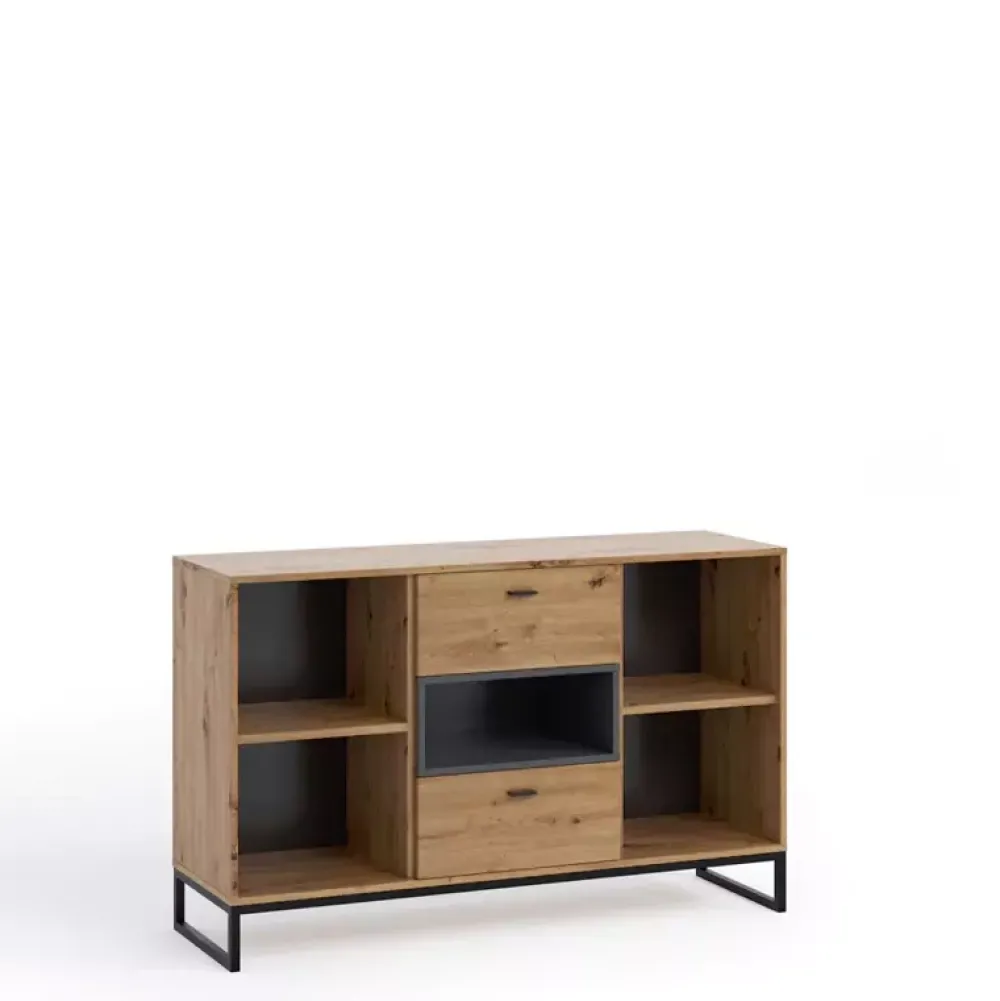 Komoda na industrialnych, metalowych nogach ma 135 cm szerokości i została wyposażona w dwie zamykane szafki, dwie szuflady oraz dwie półki.