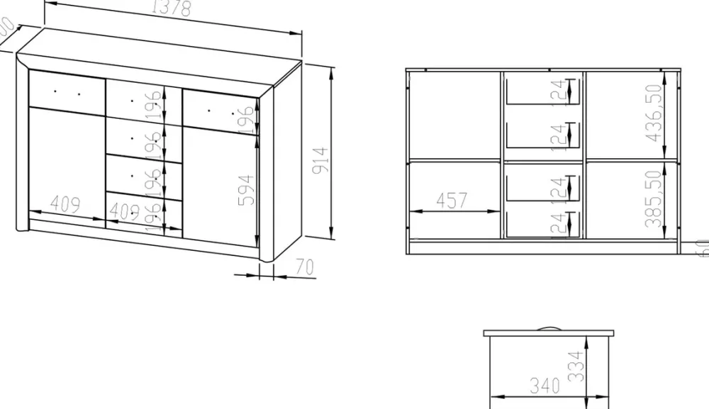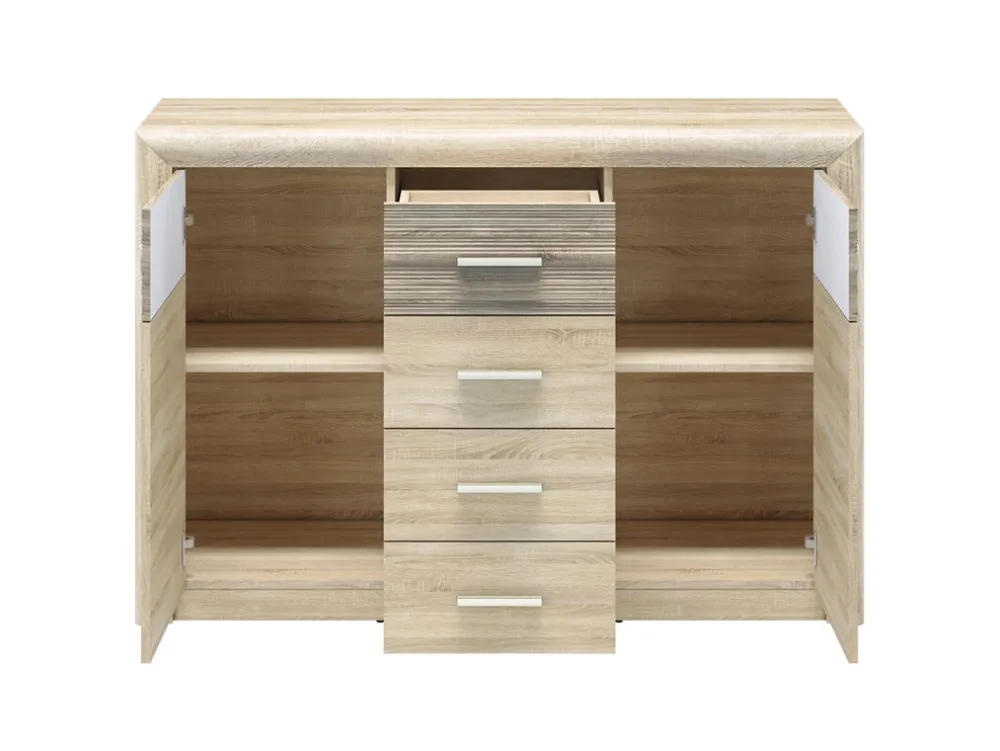 Po lewej i prawej stronie komody znajdują się drzwi, za którymi kryją się po jednej półce z każdej strony. Te pojemne przestrzenie idealnie nadają się do przechowywania większych przedmiotów, takich jak dokumenty, książki, czy zastawa stołowa. Solidne drzwi w kolorze dąb sonoma dodają komodzie elegancji, a jednocześnie chronią zawartość przed kurzem i przypadkowym uszkodzeniem.