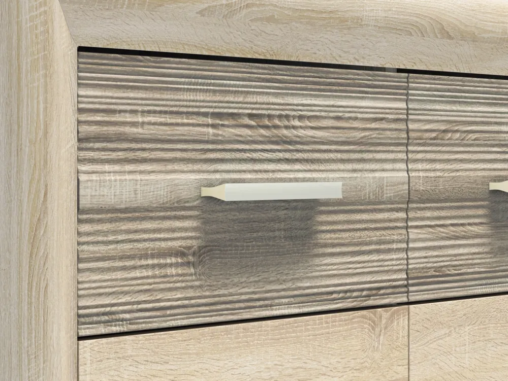Kolor dąb sonoma to synonim naturalnej elegancji, który świetnie komponuje się z różnymi stylami wnętrzarskimi. Jego ciepły odcień wprowadza do pomieszczenia przytulną atmosferę, jednocześnie podkreślając nowoczesny charakter komody. Wykonanie z wysokiej jakości materiałów zapewnia trwałość mebla, a staranne wykończenie sprawia, że komoda prezentuje się elegancko i stylowo.