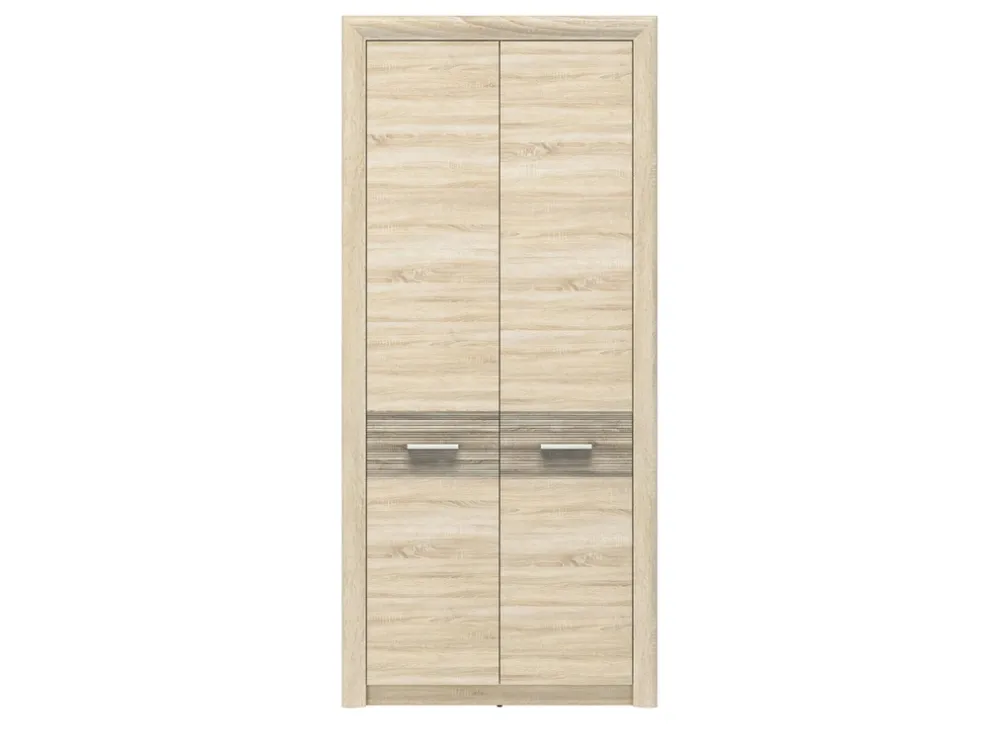 - Szafa dwudrzwiowa CASTEL posiada dwa aluminiowe drążki na wieszaki oraz cztery półki na ubrania. Szafa została wykonana w kolorze dąb sonoma z truflową wstawką wykonaną z płyty MDF. Korpus oraz front szafy wykonany z płyty laminowanej 16 mm.
