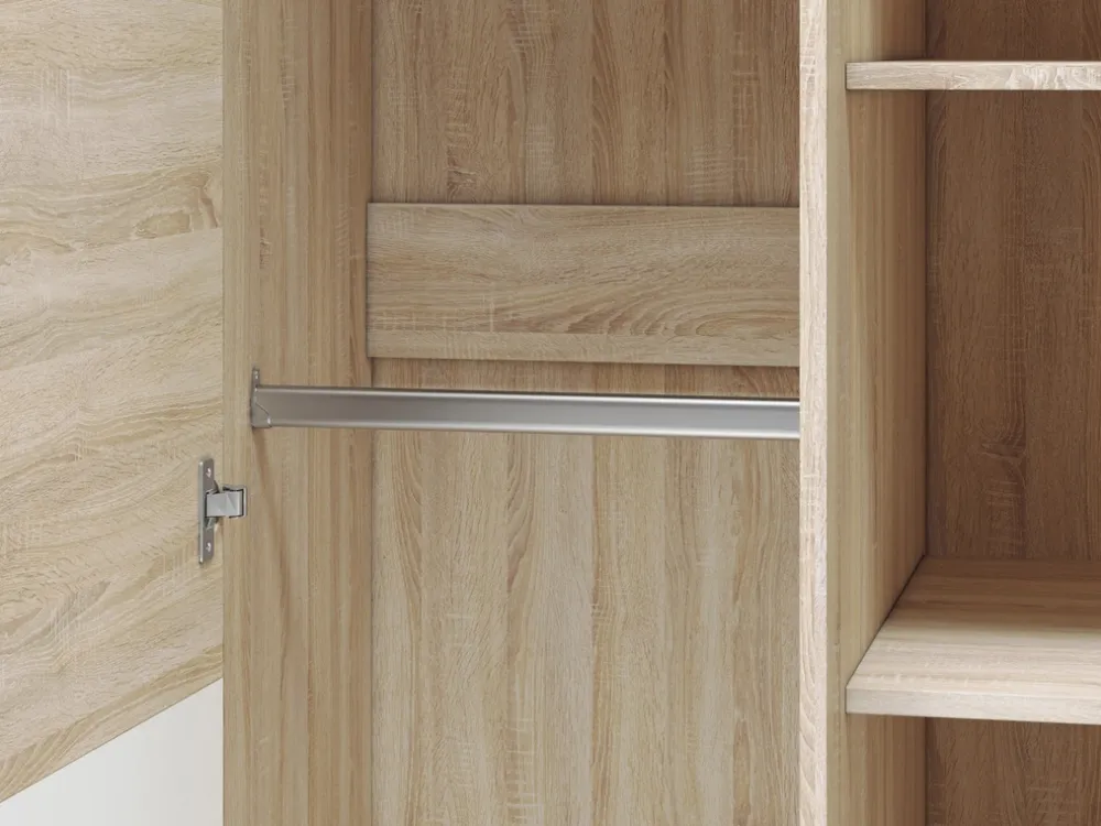 Szafa została zaprojektowana z myślą o maksymalnym wykorzystaniu dostępnej przestrzeni. Po lewej stronie znajdują się aluminiowe drążki na wieszaki, które pozwalaj a na wygodne przechowywanie odzieży wiszącej, takiej jak koszule, płaszcze czy sukienki. Solidny drążek wykonany z aluminium gwarantuje trwałość i stabilność, nawet przy większym obciążeniu.