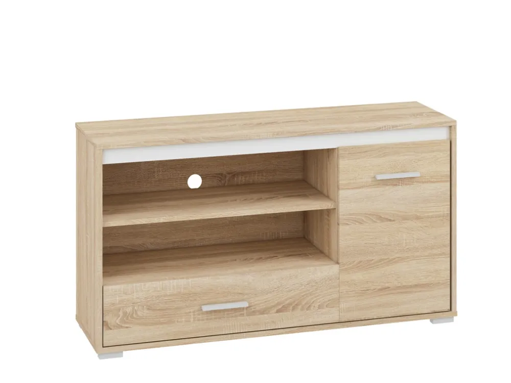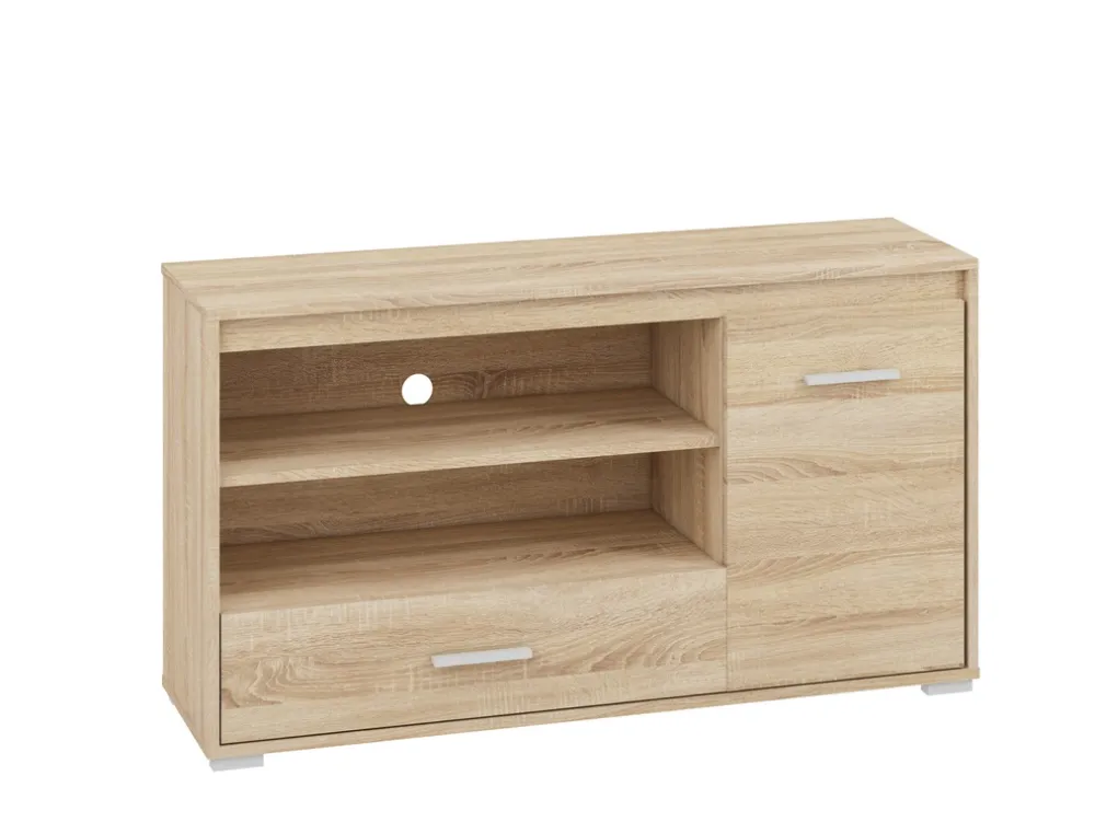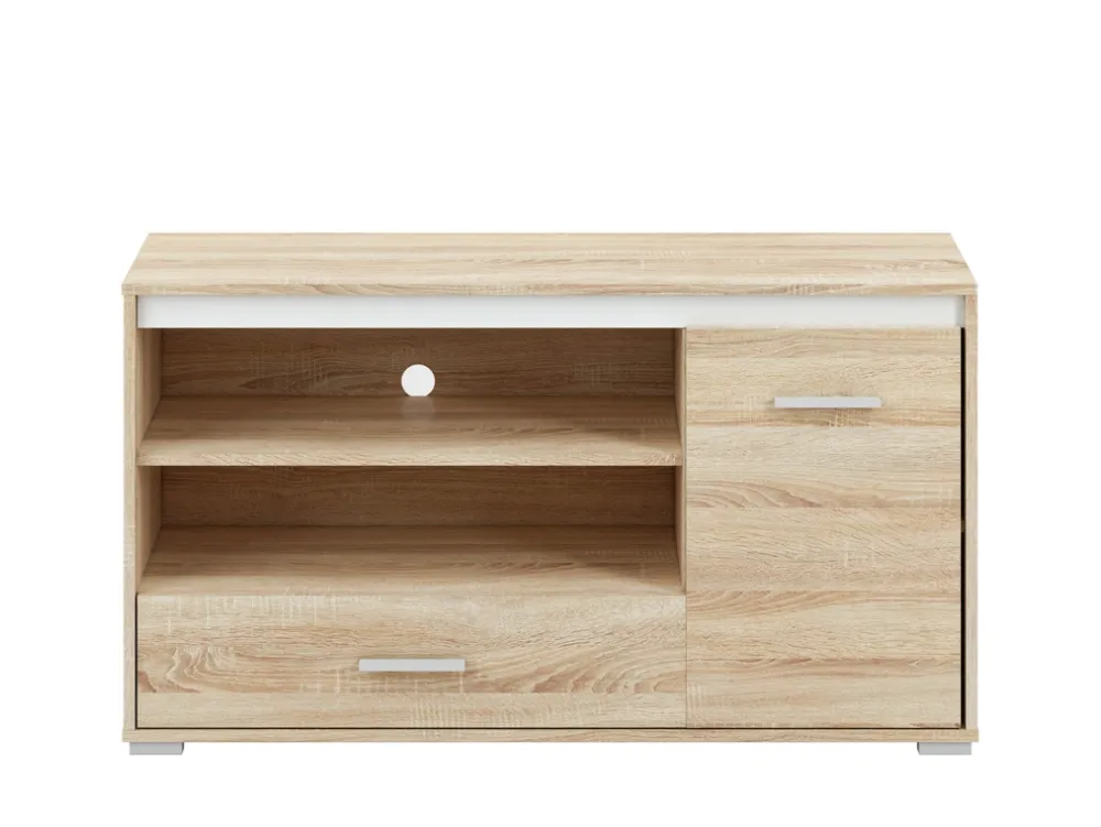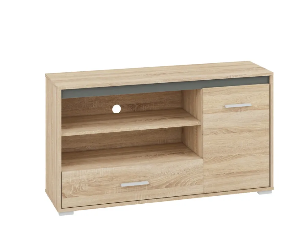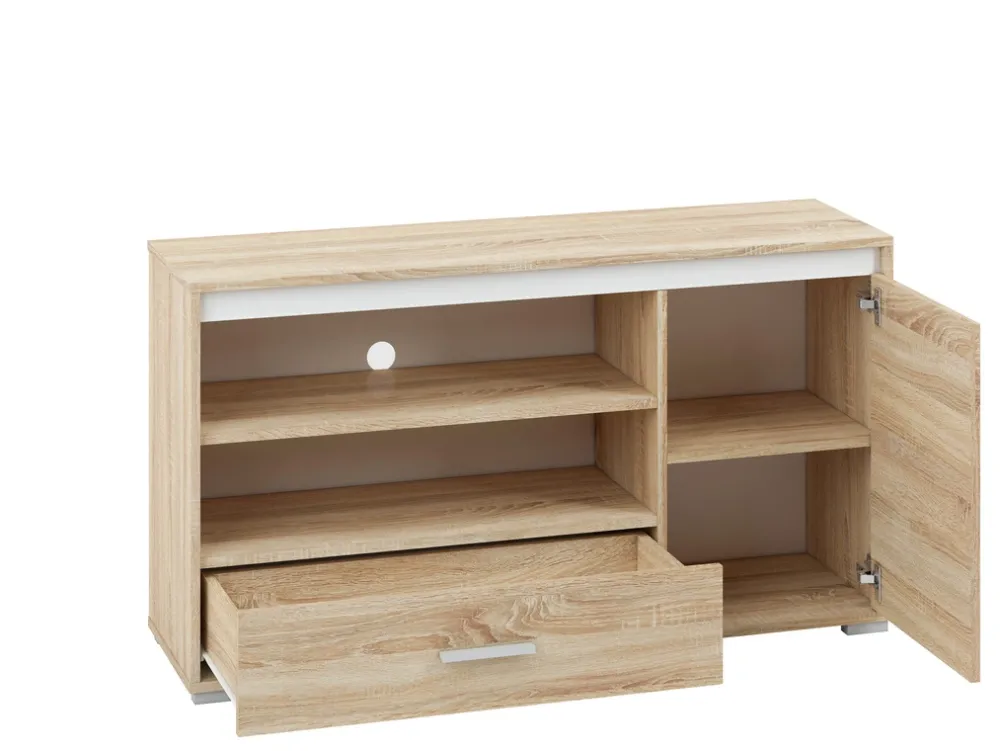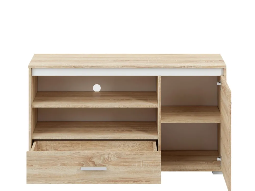 Szafka RTV została zaprojektowana z myślą o funkcjonalności. Posiada dwie otwarte półki, które doskonale sprawdzą się jako miejsce na dekoder, konsolę do gier lub odtwarzacz DVD. Otwarta konstrukcja zapewnia swobodny przepływ powietrza, chroniąc sprzęt przed przegrzewaniem się. Dodatkowo dolna szuflada to idealne miejsce na przechowywanie pilotów, kabli lub innych drobnych akcesoriów, które warto mieć pod ręką, ale schowane z dala od wzroku.