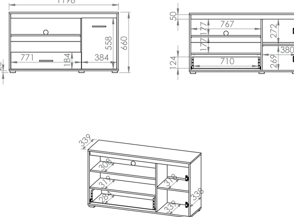 - Szafka RTV AVO posiada 120 cm szerokości. Dwie otwarte półki doskonale sprawdzą się do rozmieszczenia dekoracji i sprzętu RTV. U dołu szafki RTV znajduje się szuflada, natomiast po prawej stronie drzwi a za nimi półka na akcesoria.