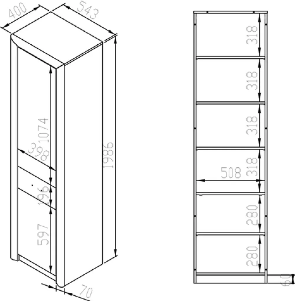 Za eleganckimi drzwiami szafy kryje się pięć przestronnych półek, które zapewniają dużo miejsca na przechowywanie odzieży i innych przedmiotów. Dzięki temu praktycznemu układowi, z łatwością utrzymasz porządek w swojej garderobie. Półki są idealne do segregowania ubrań, bielizny, a także akcesoriów, co pozwala na łatwy dostęp do wszystkich niezbędnych rzeczy.