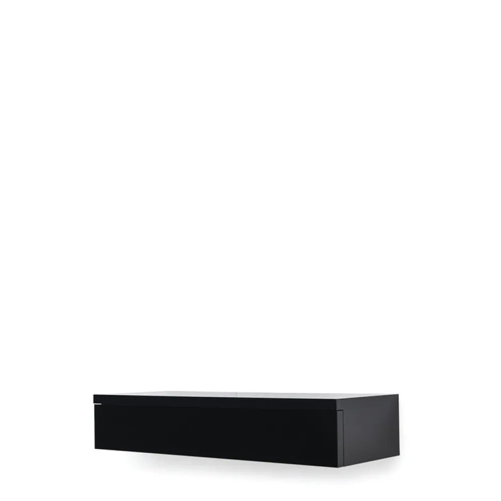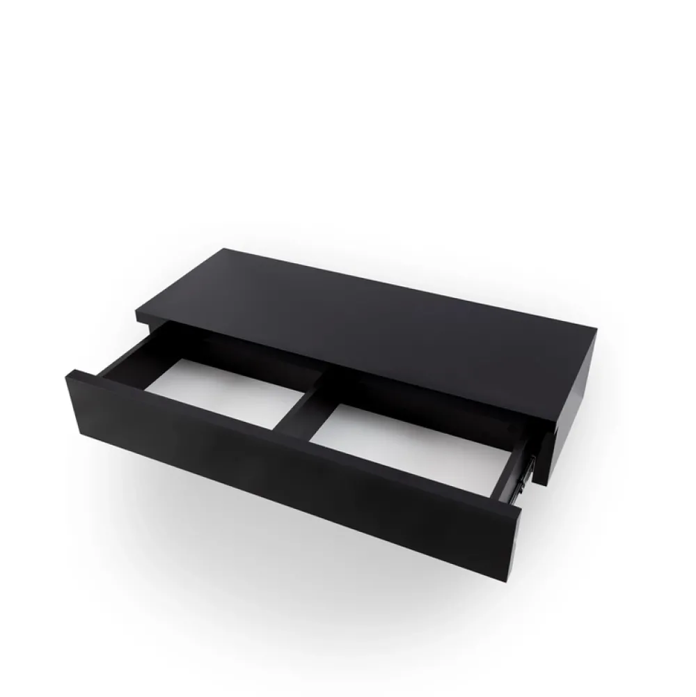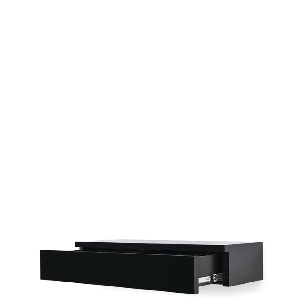 Toaletka, wykonana z wytrzymałej płyty laminowanej o grubości 32 mm, zachwyca głębokim, czarnym kolorem, który dodaje jej elegancji i charakteru. Dzięki wiszącej konstrukcji zyskujesz dodatkową przestrzeń podłogową, a Twoja sypialnia staje się bardziej przestronna. Toaletka wyposażona jest w jedną szufladę, idealną do przechowywania drobiazgów i kosmetyków. Czarny połysk frontu szuflady doskonale uzupełnia korpus, nadając całości spójnego, nowoczesnego wyglądu.