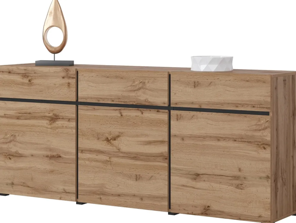 - Duża komoda do salonu CROSS o szerokości 180 cm wyposażona została w trzy szuflady i troje drzwi, za którymi kryją się półki. Zarówno drzwi jak i szuflady otwierają się poprzez złapanie za krawędź. Obrzeża mebla przed uszkodzeniami chroni okleina ABS.