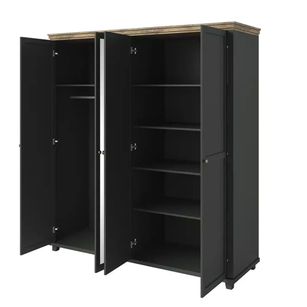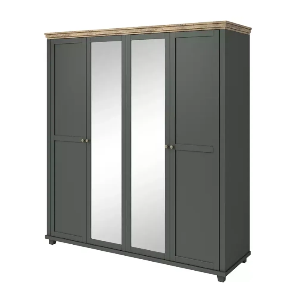 Zestaw klasycznych mebli do sypialni składający się z szafy czterodrzwiowej z lustrami, łóżka dwuosobowego bez pojemnika na pościel oraz dwóch stolików nocnych.