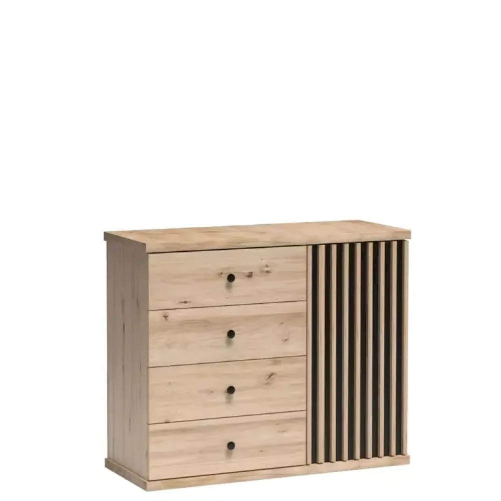 Komoda CALIS jest propozycją, która dzięki swojej stylistyce doskonale sprawdza się zarówno w sypialniach, jak i współczesnych aranżacjach salonów. Cztery pojemne szuflady oraz półka, która znajduje się za drzwiami wykonanymi w formie lameli to gwarancja dużej ilości miejsca mimo niewielkich rozmiarów.