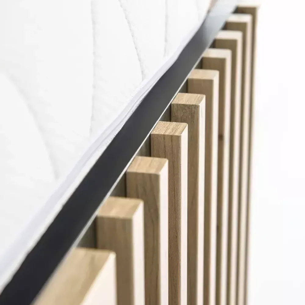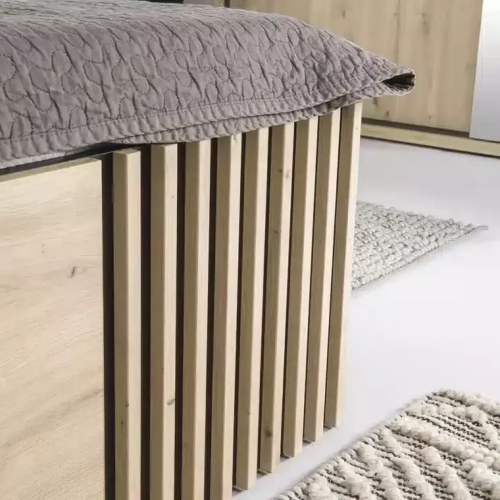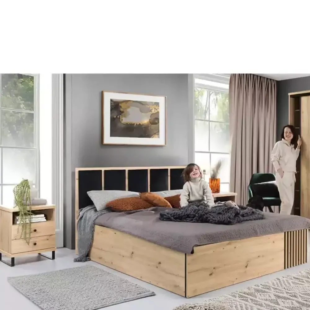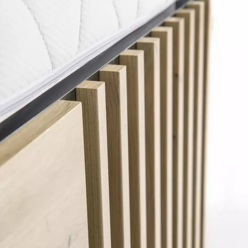 Łóżko do sypialni CALIS to propozycja dla osób poszukujących niekonwencjonalnych rozwiązań, oferujących najwyższą jakość wykonania. Łóżko zostało wyposażone w tapicerowany zagłówek oraz lamele na froncie, które nadają mu niepowtarzalnego charakteru.