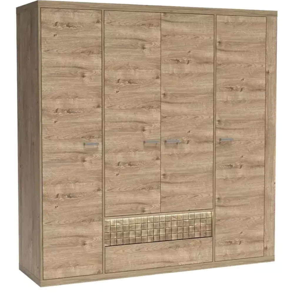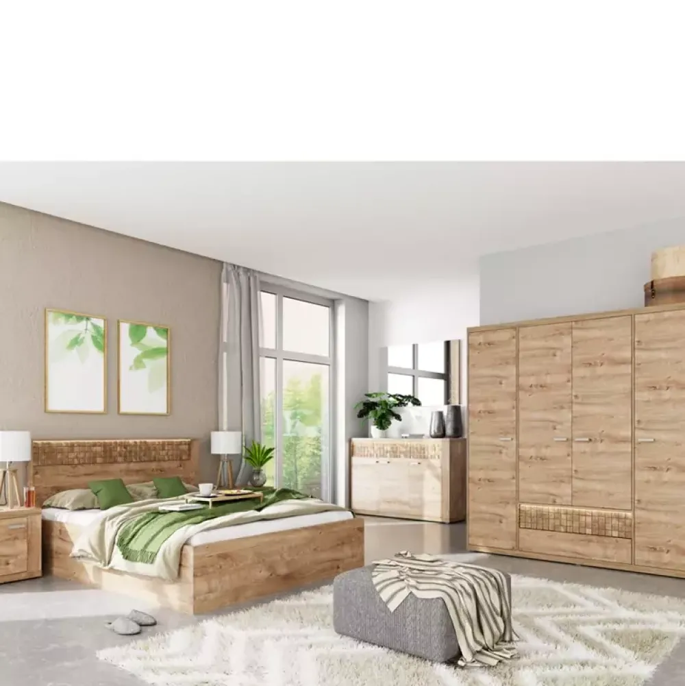 Zestaw mebli NORIENTE jest propozycją, która pozwoli ci kompleksowo umeblować sypialnię. W skład zestawu wchodzi szafka nocna i łóżko ze stelażem, pod którym znajdziesz miejsce na swoje pościele. W zestawie nie zabrakło również lustra, oraz dużej, pojemnej szafy wraz z komodą, które pozwolą ci zyskać miejsce na znaczną część garderoby.