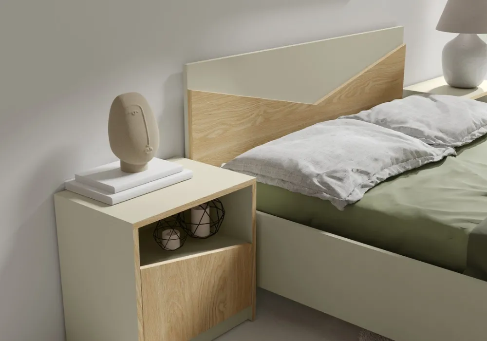 Szary beż połączony z dębem oliwkowym: Nowoczesne i subtelne zestawienie kolorów, które wprowadza do sypialni spokój i harmonię. Ten wariant kolorystyczny doskonale komponuje się z minimalistycznymi oraz skandynawskimi aranżacjami wnętrz, tworząc przytulną atmosferę.