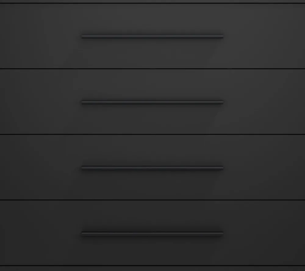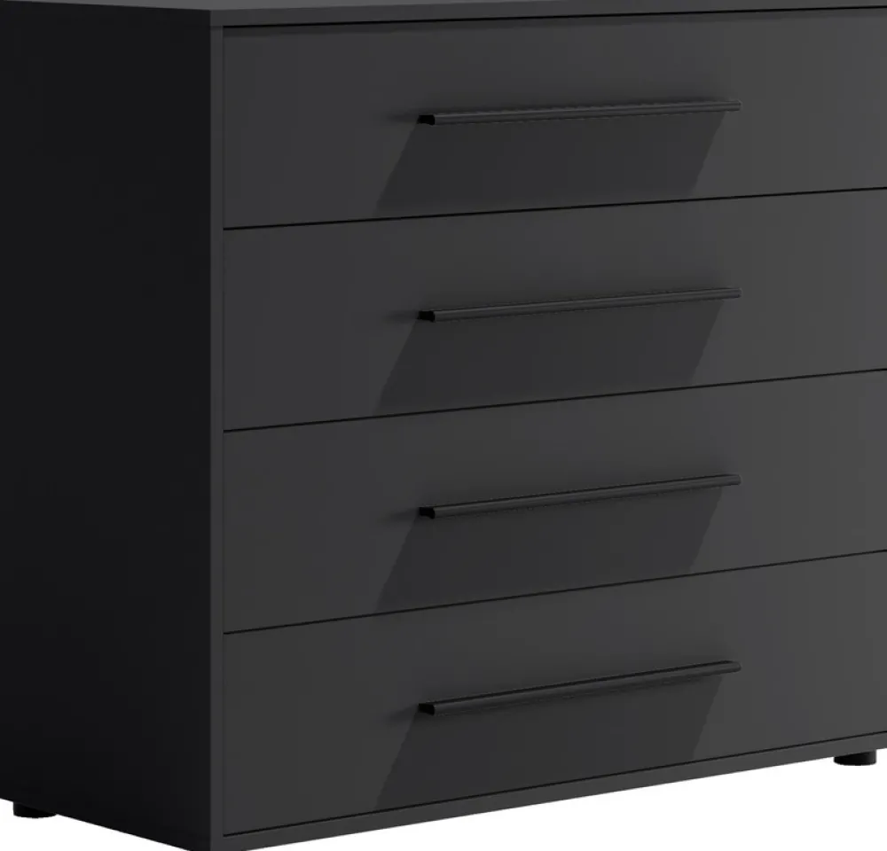 - Komoda MAXIDO czarna – elegancka, nowoczesna i funkcjonalna. Cztery szuflady na prowadnicach kulkowych, minimalistyczne czarne uchwyty i wytrzymała konstrukcja z płyty wiórowej 16 mm. Wymiary: 98,8x40x87,2 cm. Doskonała do nowoczesnych przestrzeni.