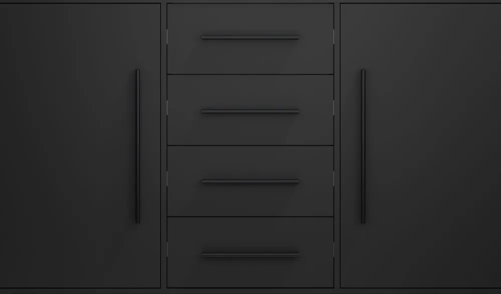 Komoda z kolekcji MAXIDO to idealne połączenie minimalizmu, funkcjonalności i nowoczesnego stylu. Cztery pojemne szuflady oraz dwie zamykane szafki z półkami pozwalają uporządkować przestrzeń w salonie, sypialni, biurze czy pokoju młodzieżowym. Czarny kolor z kontrastującymi czarnymi uchwytami doskonale wpisuje się w aktualne trendy aranżacyjne.
