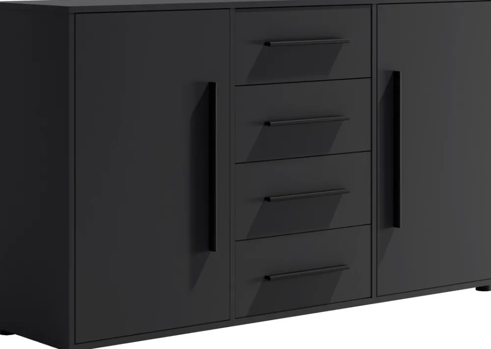 - Komoda MAXIDO czarna z 4 szufladami i 2 szafkami to nowoczesne rozwiązanie do przechowywania. Wykonana z płyty wiórowej 16 mm, z prowadnicami kulkowymi i uchwytami w kolorze czarnym. Wymiary: 150x40x87,2 cm. Solidna konstrukcja i funkcjonalność.