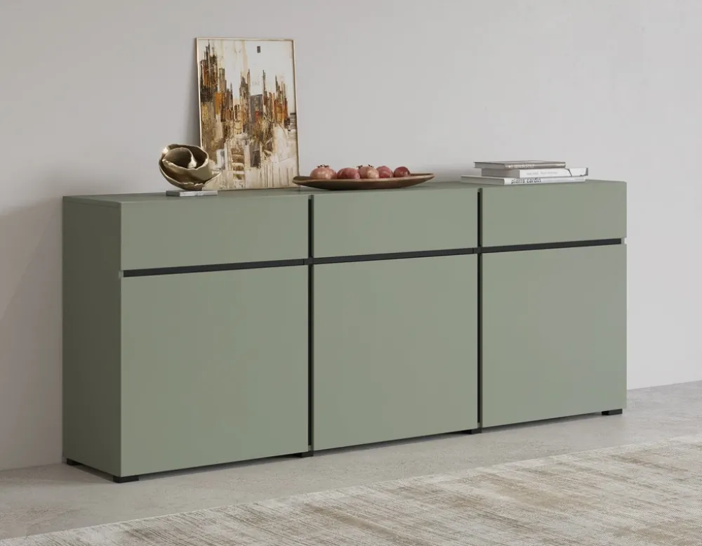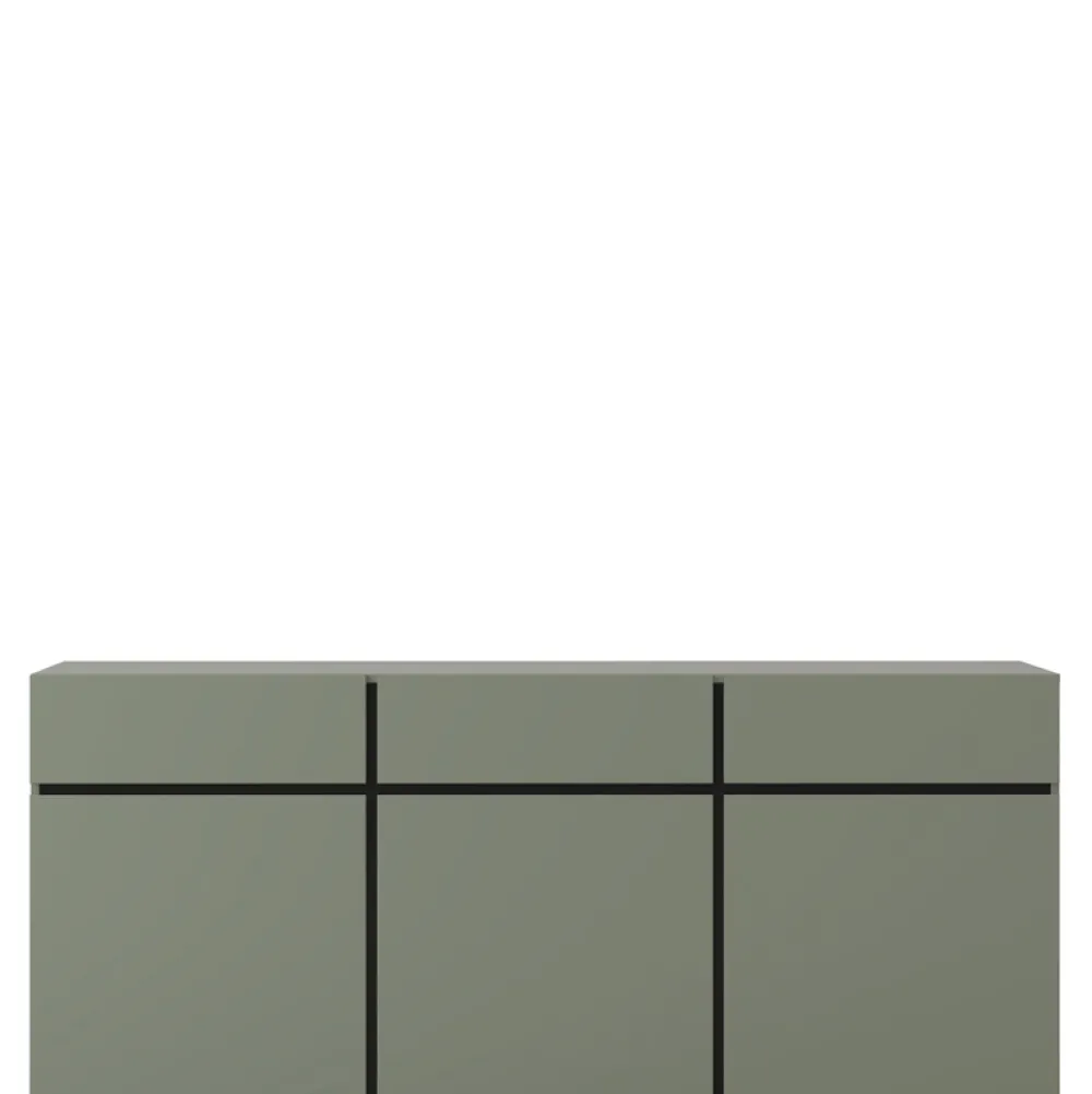 - Komoda CROSS 180 cm w matowej zieleni to nowoczesny mebel z trzema szufladami i trzema zamykanymi szafkami. Bezuchwytowe otwieranie, trwała płyta laminowana i czarne nóżki sprawiają, że to idealne rozwiązanie do stylowego przechowywania w salonie.