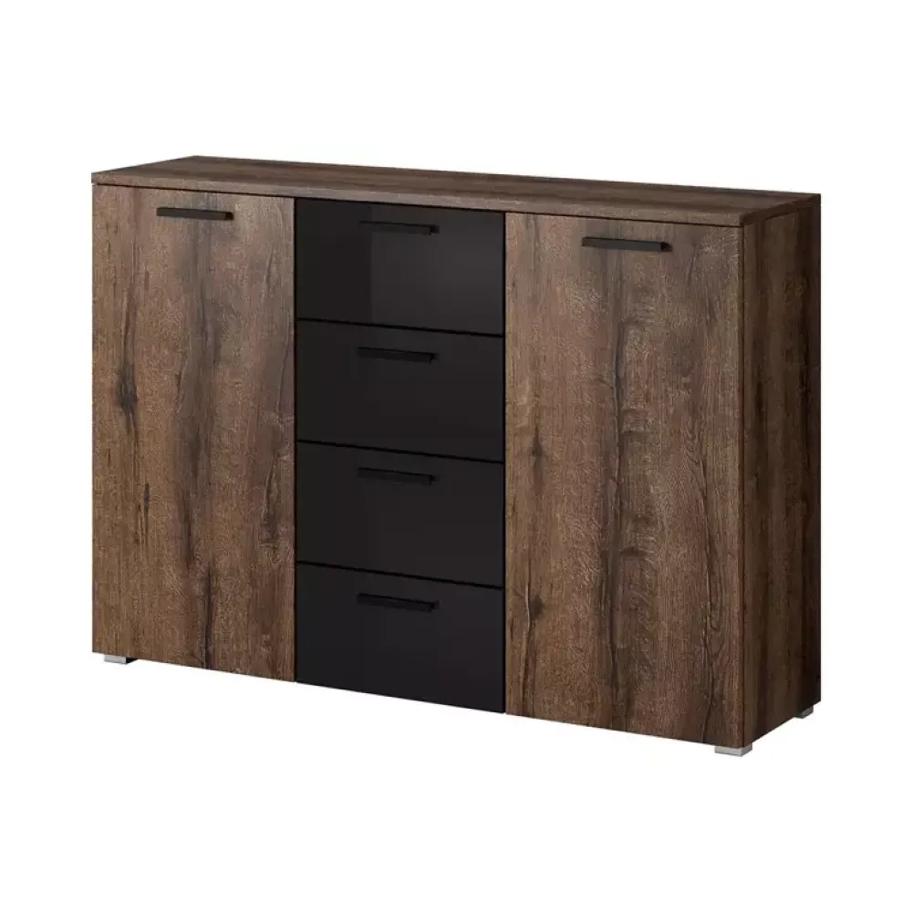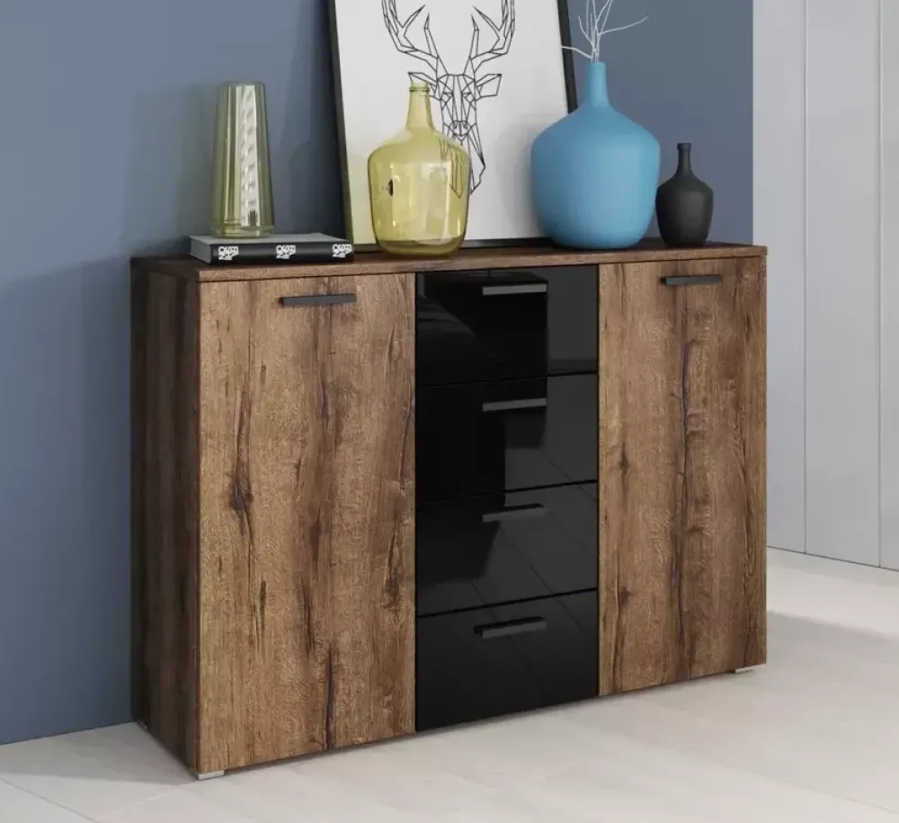 - Stylowa komoda z drzwiami uchylnymi oraz szufladami o szerokości 132 cm