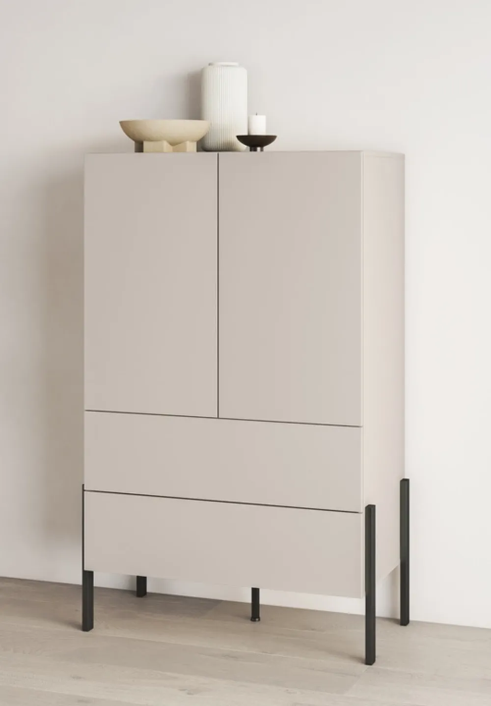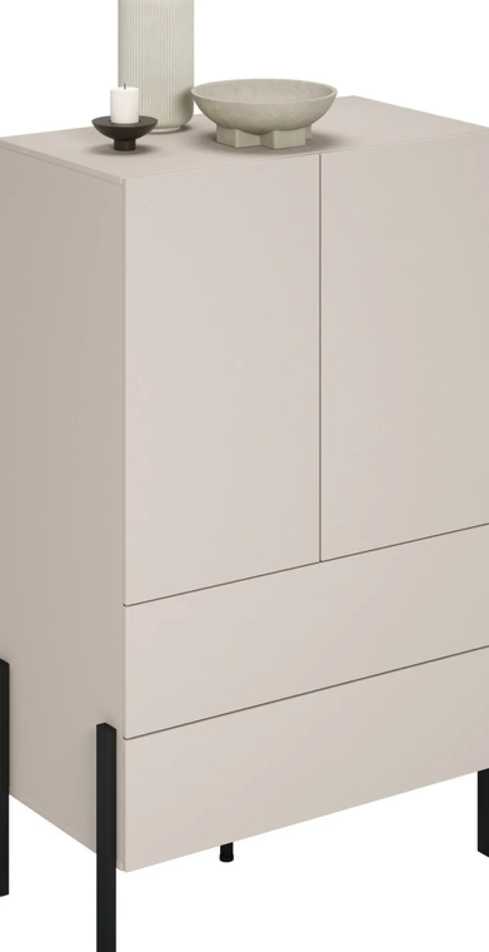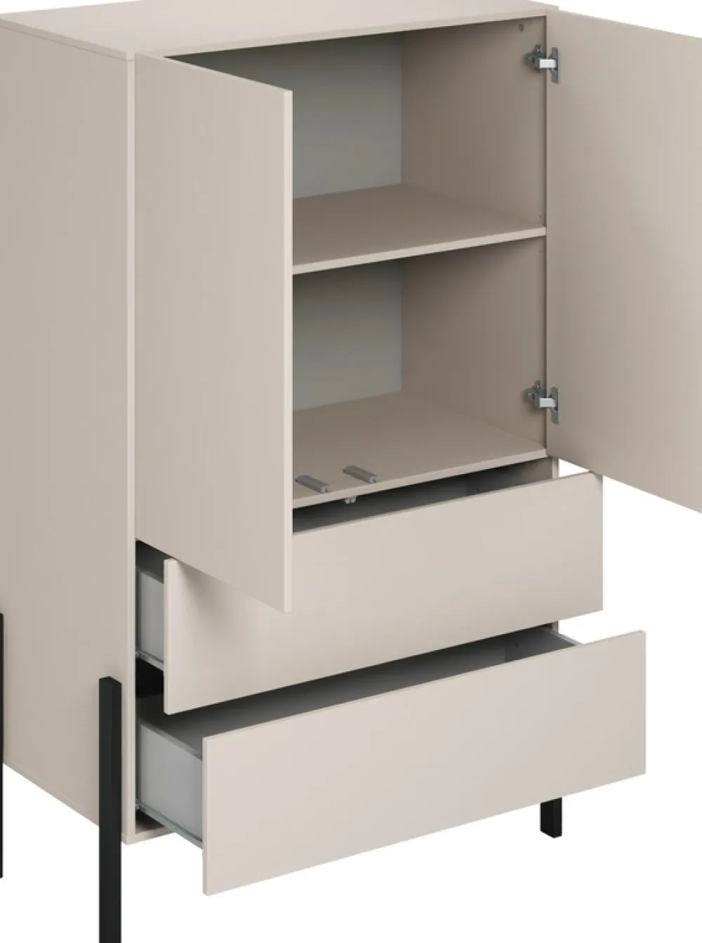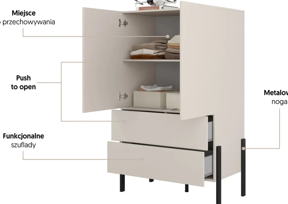 Stylowa komoda do sypialni 90 cm to doskonały wybór dla osób, które cenią minimalistyczny design i praktyczne rozwiązania. Jasna kolorystyka w odcieniu kaszmiru, smukłe czarne nogi oraz system push-to-open sprawiają, że mebel prezentuje się lekko i elegancko, doskonale wpisując się w aranżacje nowoczesnych wnętrz. Komoda oferuje przestronne półki i pojemne szuflady, które pomogą zapanować nad domowym chaosem – idealna do salonu, sypialni czy przedpokoju.