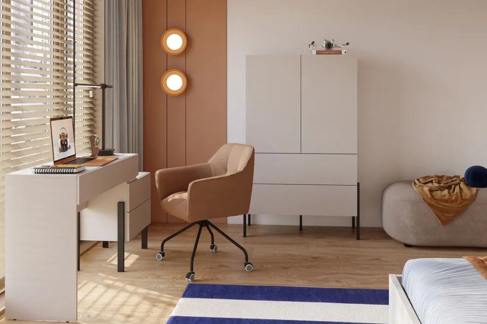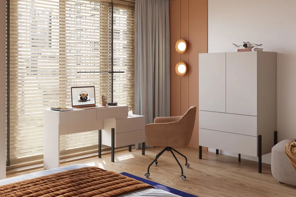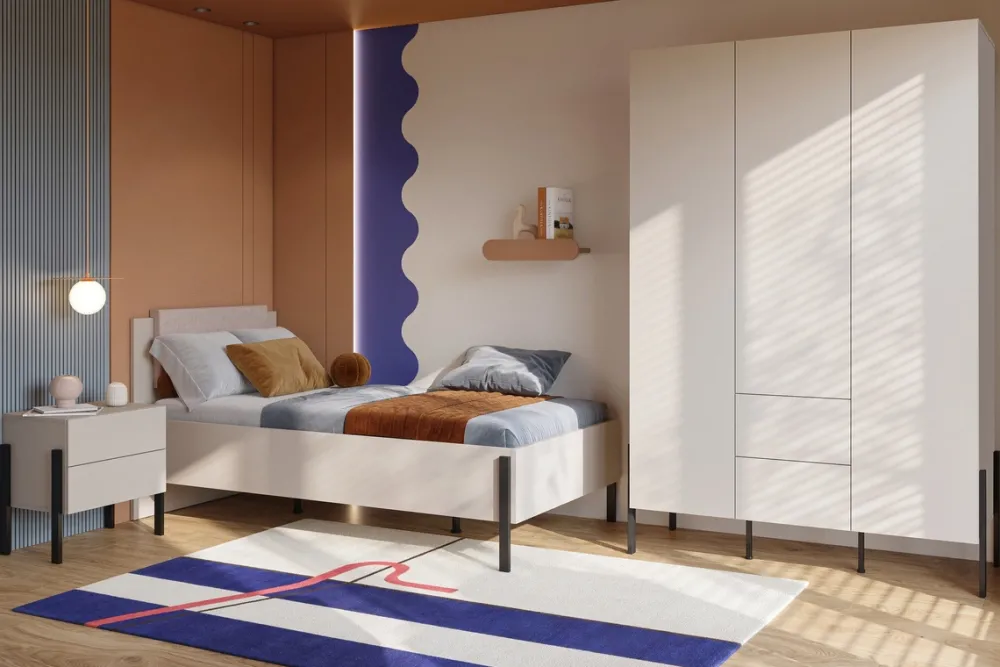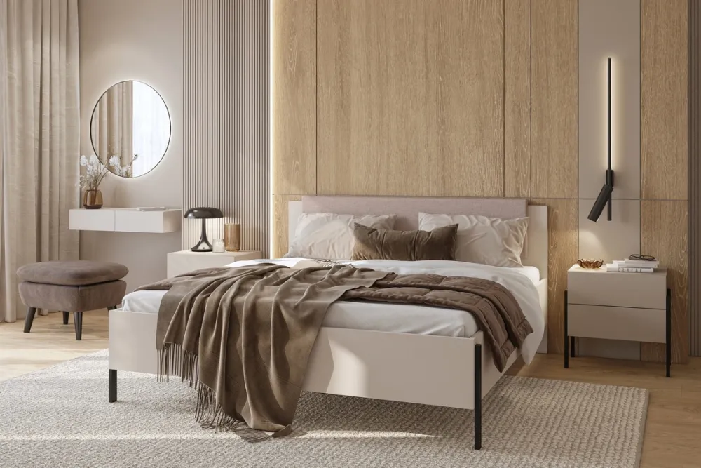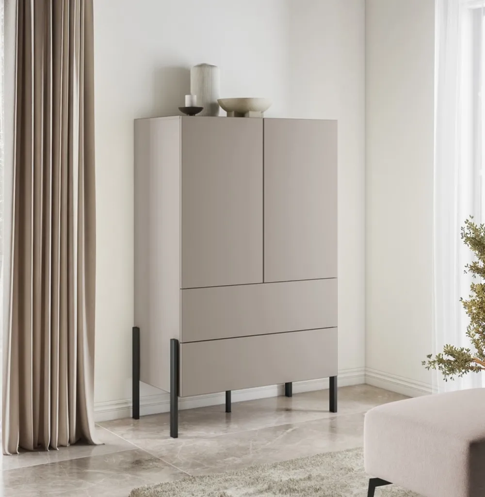 Stylowa komoda do sypialni 90 cm to doskonały wybór dla osób, które cenią minimalistyczny design i praktyczne rozwiązania. Jasna kolorystyka w odcieniu kaszmiru, smukłe czarne nogi oraz system push-to-open sprawiają, że mebel prezentuje się lekko i elegancko, doskonale wpisując się w aranżacje nowoczesnych wnętrz. Komoda oferuje przestronne półki i pojemne szuflady, które pomogą zapanować nad domowym chaosem – idealna do salonu, sypialni czy przedpokoju.