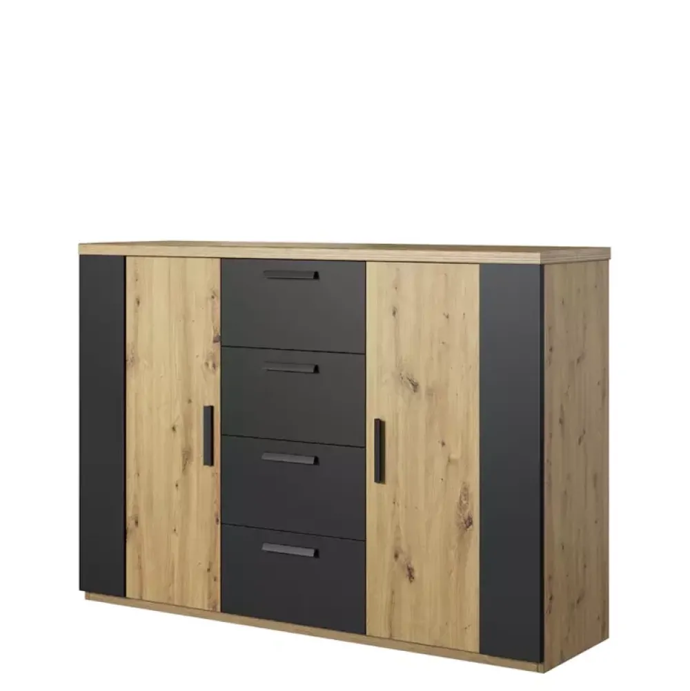 Komoda SAVRELO jest propozycją wykonaną w ponadczasowej oraz niebanalnej stylistyce, dzięki której w znakomity sposób odnajduje się we współczesnych aranżacjach sypialni. Komoda została wyposażona w cztery pojemne szuflady osadzone na prowadnicach rolkowych, w których znajdziesz miejsce na swoje akcesoria oraz skarpety czy bieliznę. Komoda posiada również drzwi po lewej i prawej stronie, gdzie za każdymi z nich znajdują się dwa poziomy gotowe na zagospodarowanie twojej garderoby.