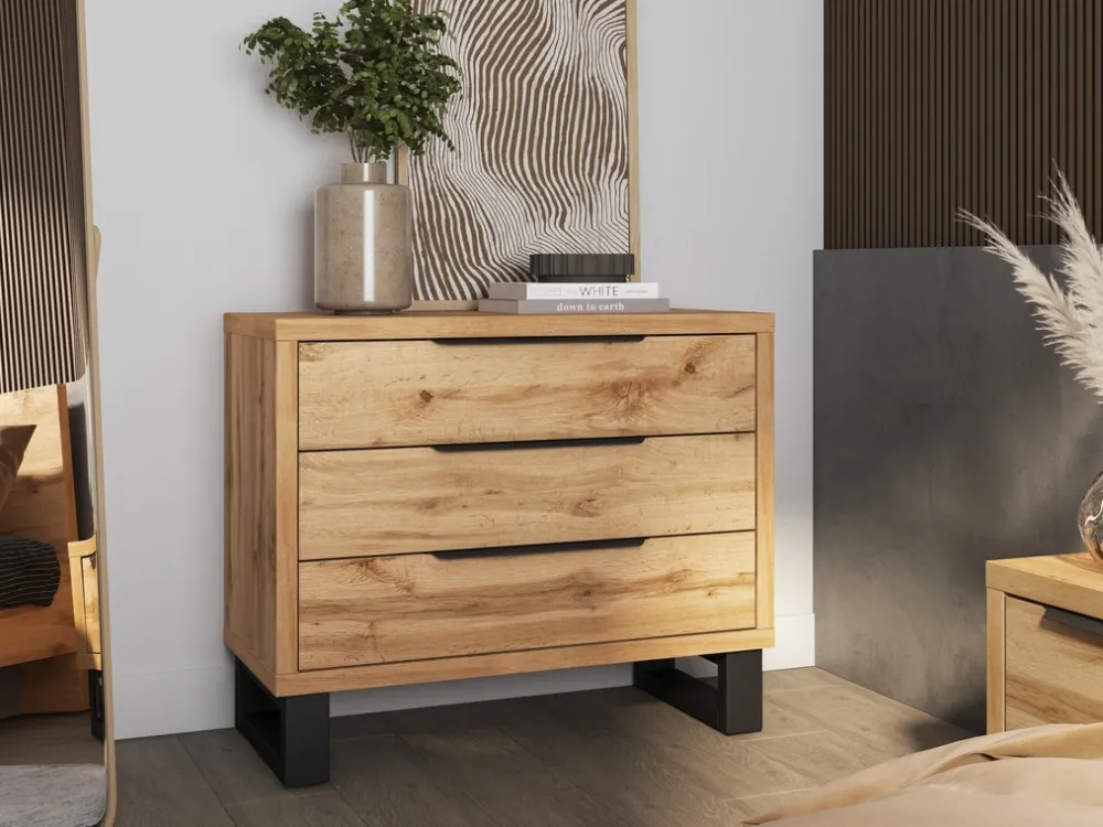 Ta elegancka komoda do sypialni HALLE S to połączenie funkcjonalności i nowoczesnego designu, które idealnie wpasuje się w wystrój każdej przestrzeni. Wyposażona w trzy pojemne szuflady na prowadnicach rolkowych, zapewnia komfortowe i ciche użytkowanie, ułatwiając dostęp do przechowywanych rzeczy. To praktyczne rozwiązanie dla osób ceniących porządek i styl.