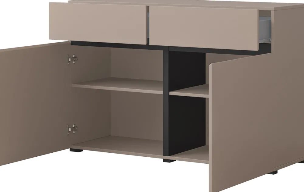 Nowoczesna komoda z szufladami CROSS to mebel, który łączy w sobie estetykę i funkcjonalność. Wyposażona w dwoje drzwi oraz dwie przestronne szuflady, oferuje mnóstwo miejsca do przechowywania. To idealne miejsce na przechowywanie ubrań, dokumentów, książek, czy innych domowych przedmiotów. Dzięki temu Twoje wnętrze zawsze będzie uporządkowane i schludne.