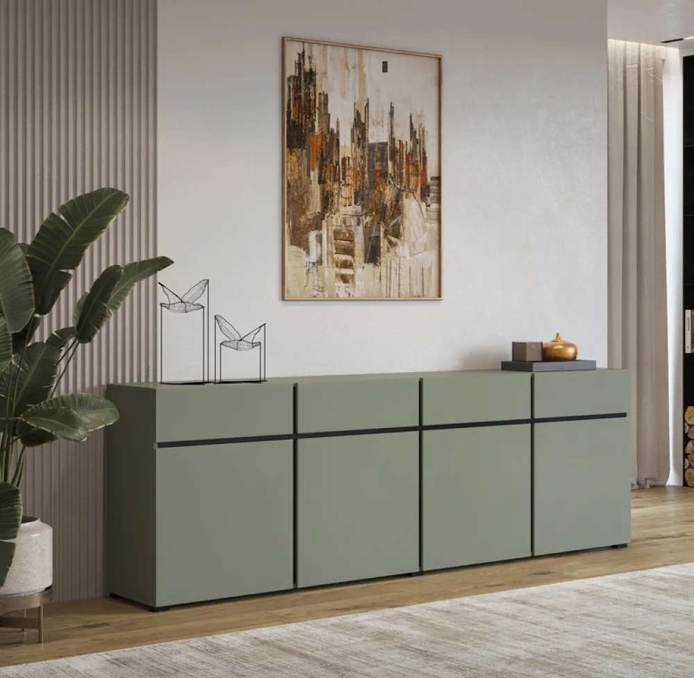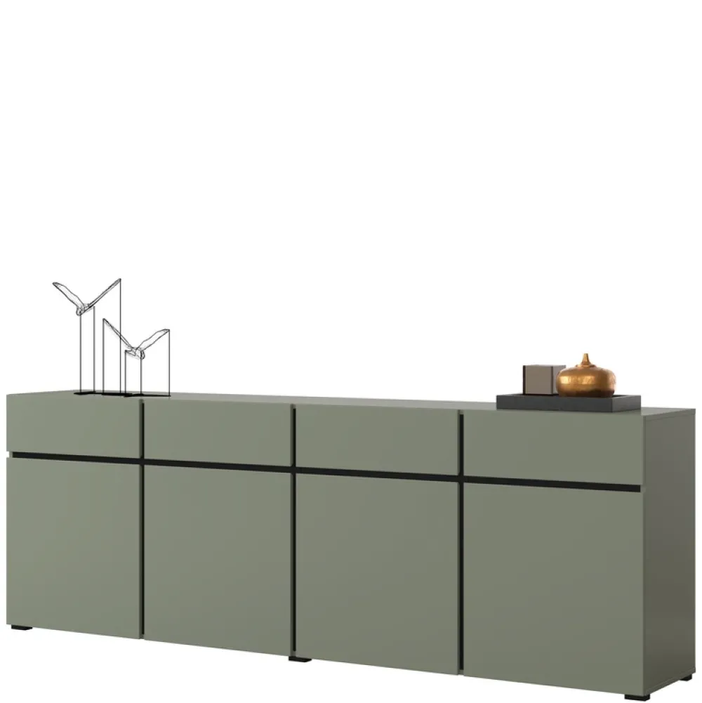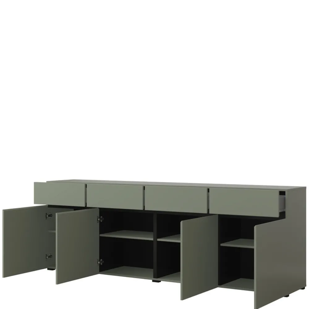 - Komoda CROSS o szerokości 225 cm to nowoczesny mebel w matowej zieleni, z czterema szufladami i czterema szafkami z półkami. Bezuchwytowe otwieranie, trwała płyta laminowana i czarne nóżki tworzą stylowe, pojemne rozwiązanie do salonu lub biura.