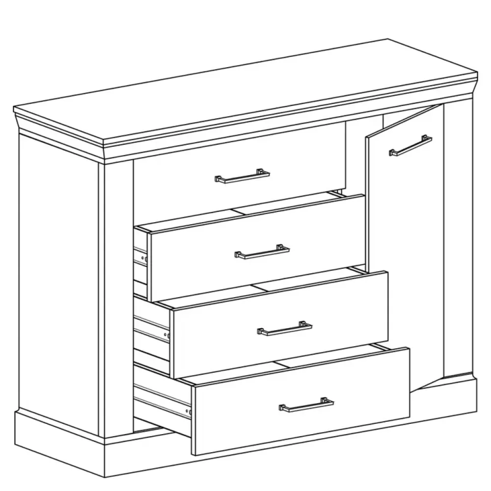 - Komoda ADRE jest elegancko wykonaną bryłą, dzięki czemu doskonale odnajduje się we klasycznych aranżacjach pomieszczeń. Komoda została wyposażona w cztery szuflady oraz szafkę po prawej stronie, w której znajduje się półka.