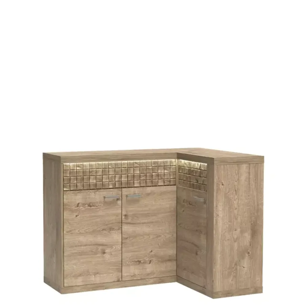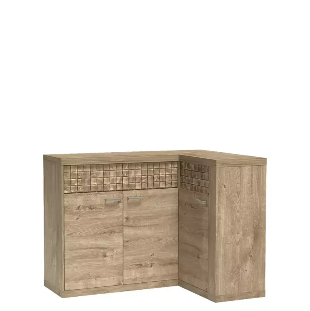 - Komoda narożna NORIENTE jest pojemną propozycją, która doskonale sprawdzi się jako miejsce na ubrania oraz akcesoria. Komoda posiada półkę za parą drzwi w swojej lewej oraz prawej części, natomiast nad szafkami znajduje się szuflada.