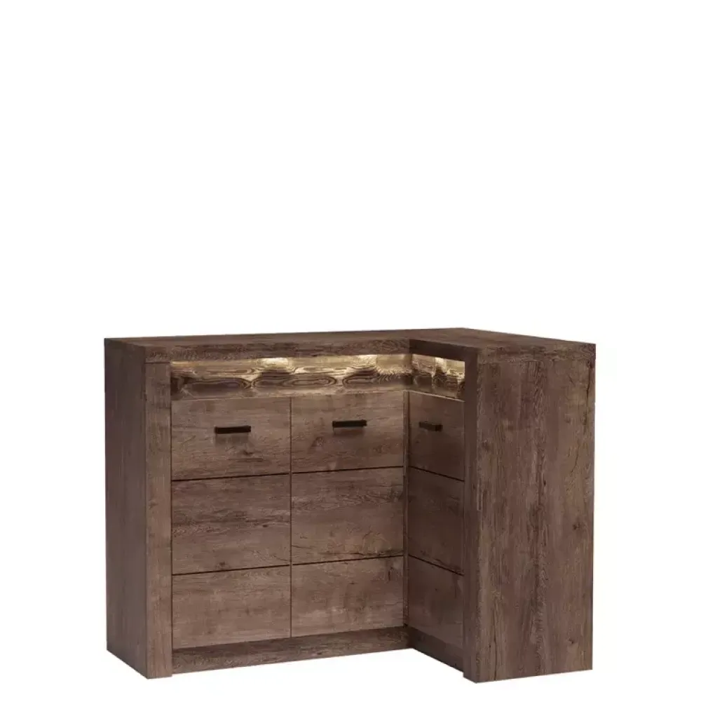 - Komoda narożna INELI to pojemna propozycja przeznaczona dla osób szanujących przestrzeń w swoim pomieszczeniu. Została wyposażona w parę drzwi po lewej stronie, za którymi znajduje się półka oraz drzwi po prawej stronie, które również kryją za sobą półkę.