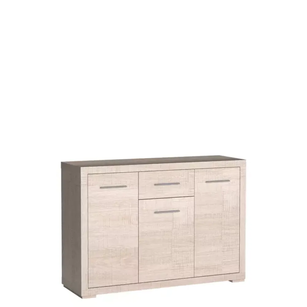 Komoda VIETA to bardzo pojemna propozycja, która dzięki wykonaniu w nowoczesnej stylistyce w świetny sposób zdobi pomieszczenie oraz nadaje mu niepowtarzalnych akcentów stylistycznych. Natomiast pojemne wnętrze komody zagwarantuje ci miejsce na twoje ubrania oraz akcesoria. Drzwi znajdujące się po bokach kryją za sobą półki, natomiast w centralnej części komody swoje miejsce znalazła szuflada oraz szafka pod nią, w której znajduje się półka.