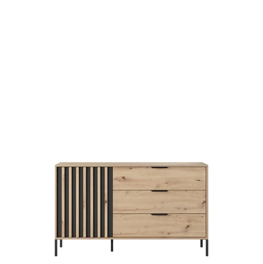 Po lewej stronie na froncie drzwi znajduje się ozdobny element w postaci lameli wykonany z płyty MDF, co dodaje niepowtarzalnego charakteru meblowi. Po prawej stronie oferuje trzy pojemne szuflady, idealne do przechowywania wszelkiego rodzaju przedmiotów. Wysokiej jakości kulkowe prowadnice z pełnym wysuwem gwarantują płynne i bezproblemowe otwieranie szuflad, dodając komodzie luksusowego wykończenia.