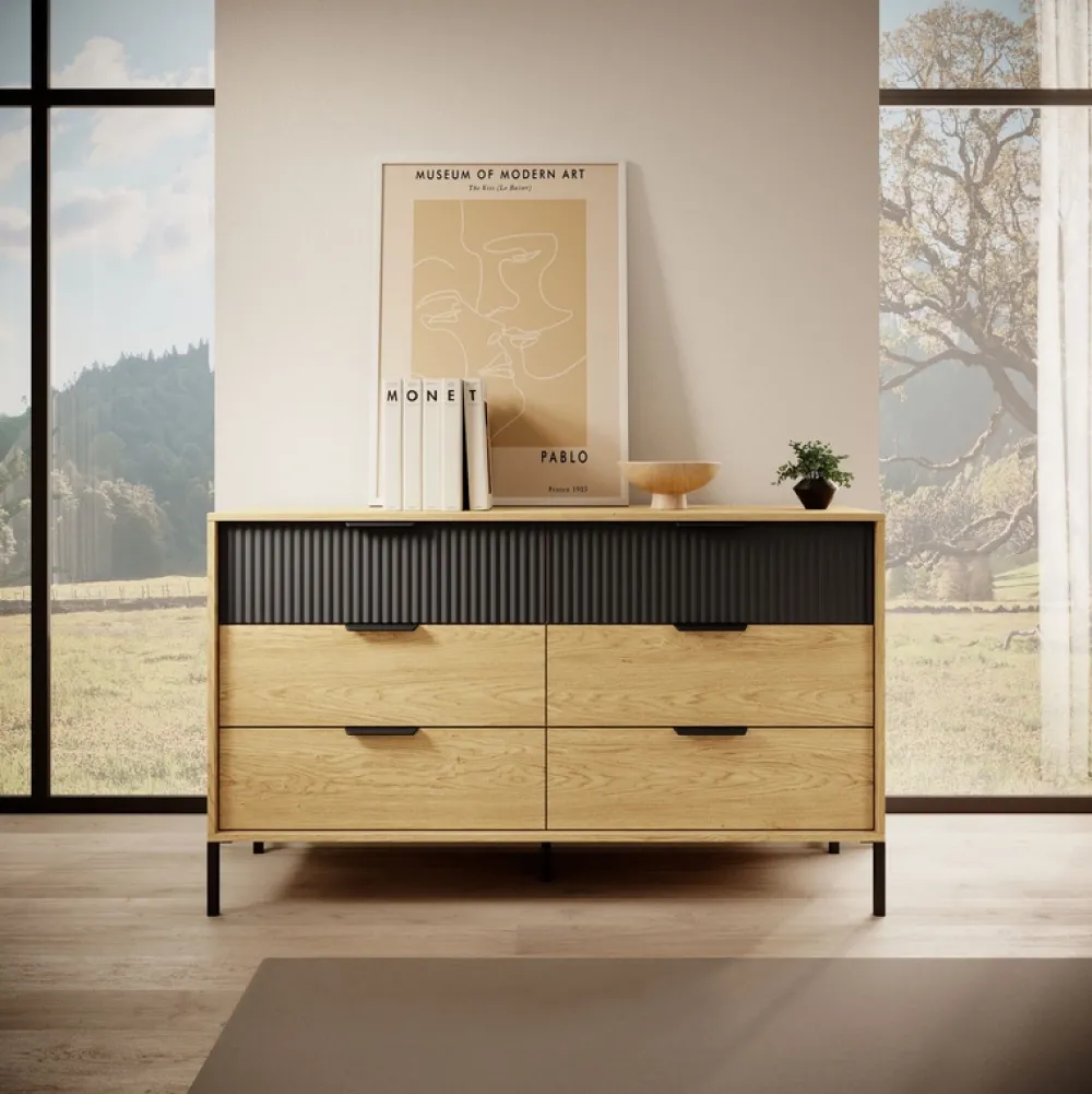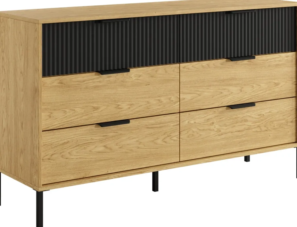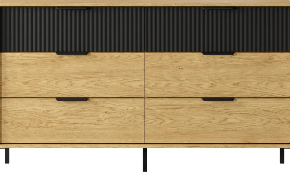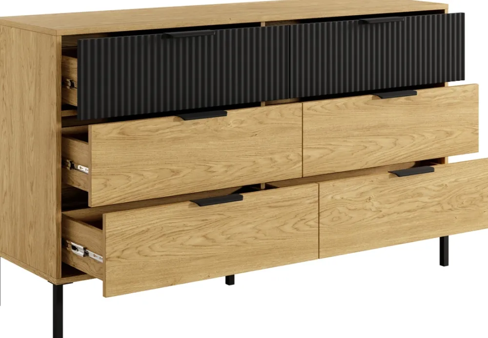 Na wysokich, czarnych metalowych nóżkach komoda do sypialni zyskuje lekkość, a jednocześnie stabilność. Wyposażona w sześć pojemnych szuflad z metalowymi uchwytami i systemem cichego domyku, zapewnia wygodne przechowywanie bez zbędnych hałasów. Obrzeża zabezpieczone okleiną ABS gwarantują trwałość i odporność na codzienne użytkowanie.