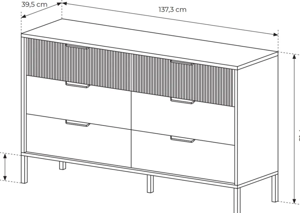 - Wysokie czarne metalowe nóżki – stabilna podstawa, która nadaje komodzie lekkości i ułatwia sprzątanie pod meblem.