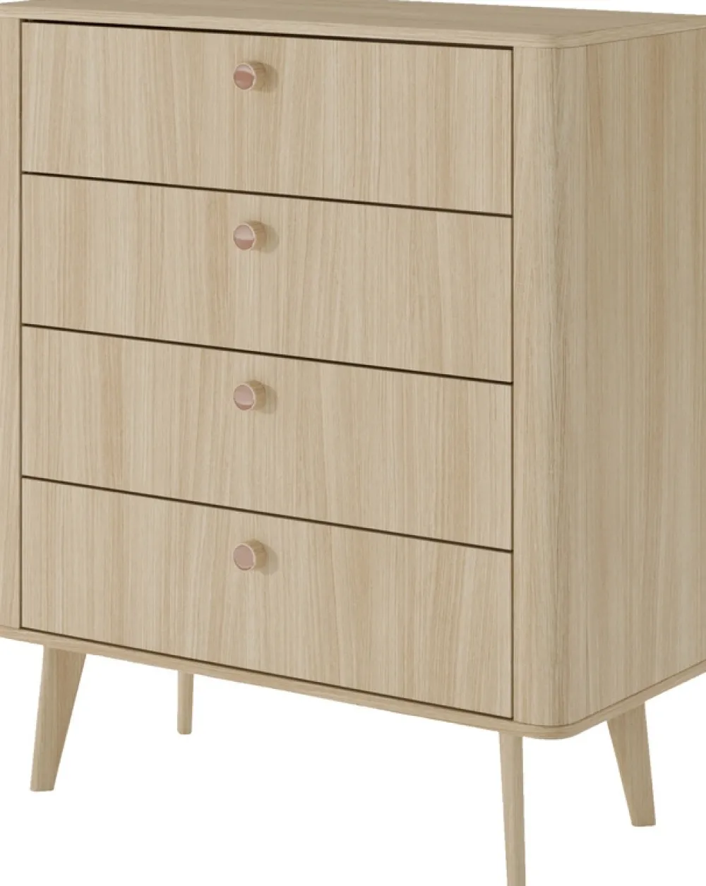 Nowoczesna komoda do salonu VELMO w wybarwieniu dąb barista to mebel, który łączy elegancję z praktycznością. Cztery pojemne szuflady, stylowe uchwyty i wysokie drewniane nóżki tworzą harmonijną całość, idealną do nowoczesnych i skandynawskich wnętrz. Komoda świetnie sprawdzi się zarówno jako mebel do przechowywania dokumentów, tekstyliów czy drobiazgów w salonie, jak i jako element aranżacji holu lub sypialni.