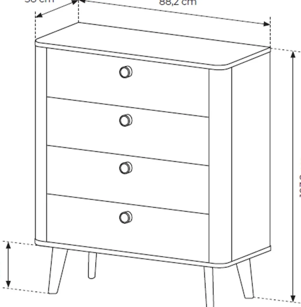 Wysoka na 103 cm bryła z czterema funkcjonalnymi szufladami sprawia, że z łatwością zorganizujesz przestrzeń, zachowując przy tym estetykę wnętrza. Drewniane elementy i wybarwienie dąb barista dodają ciepła, tworząc przytulny klimat w każdym pomieszczeniu.