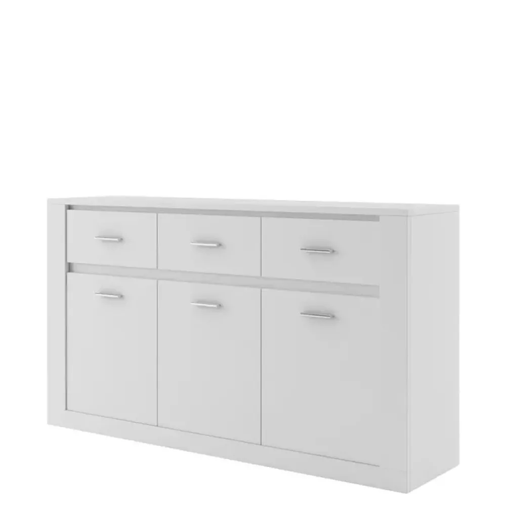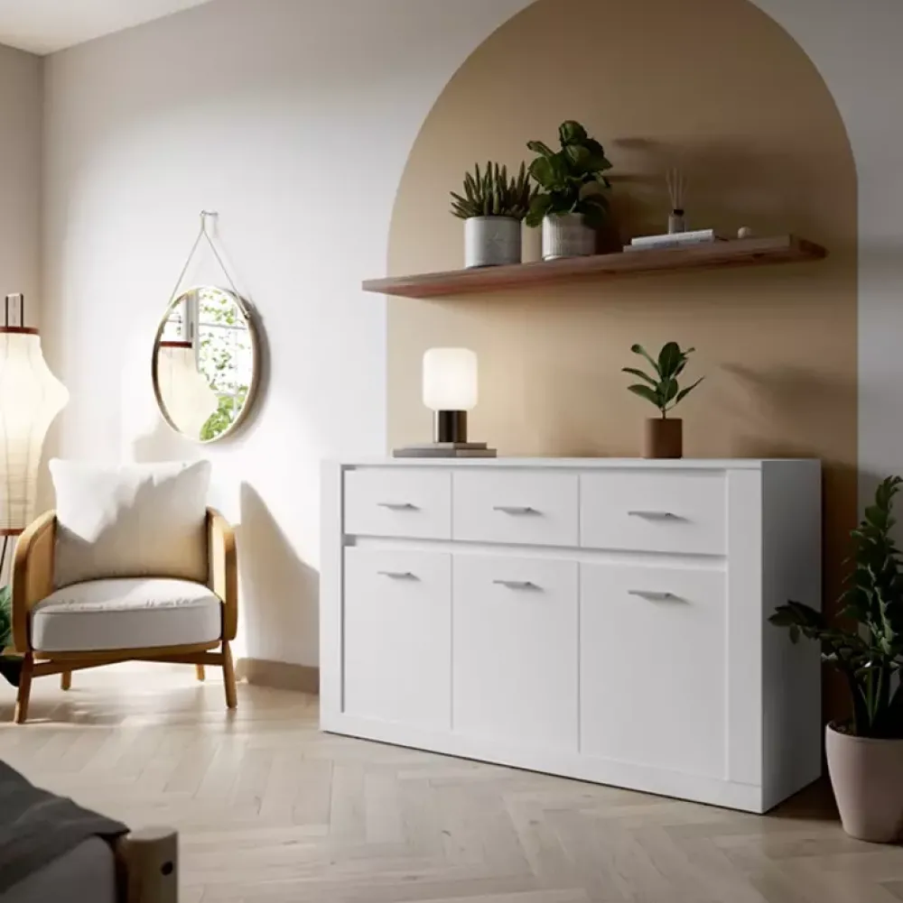 Komoda do sypialni ARTI jest funkcjonalnym i eleganckim meblem, który będzie idealnym dodatkiem do każdej współczesnej sypialni. Komoda posiada trzy szuflady z prowadnicami rolkowymi, które znakomicie sprawdzą się do umieszczenia drobniejszych elementów garderoby. Trzy drzwi na zawiasach puszkowych skrywają przestronne wnętrze z półkami, zapewniając dużo miejsca do przechowywania różnych przedmiotów.