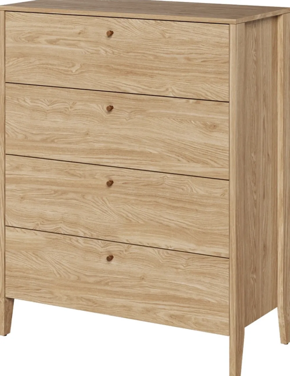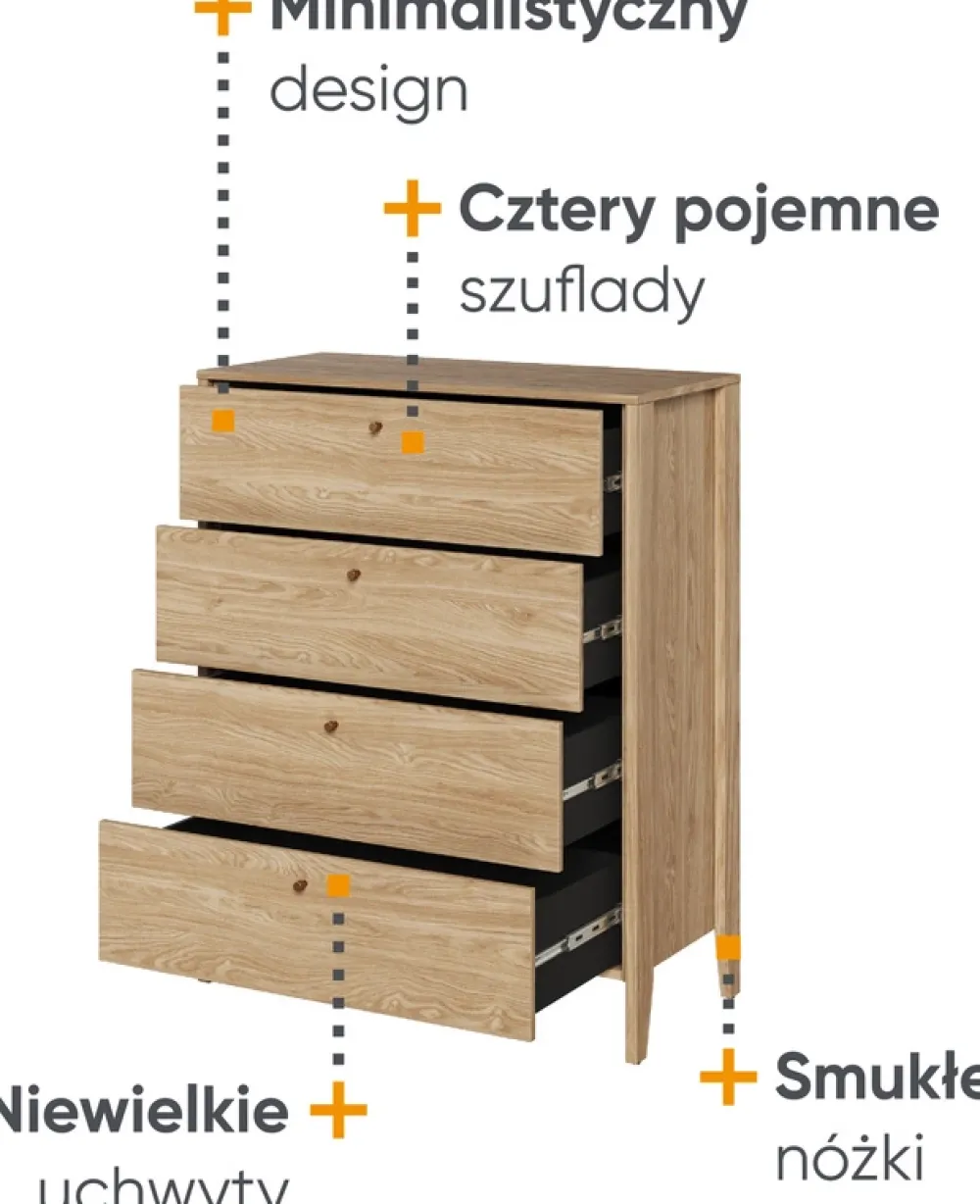 - Komoda z szufladami do sypialni COZY to propozycja wykonana w nowoczesnej stylistyce, we wspaniałym kolorze dębu olejowanego. Cztery pojemne szuflady poruszają się na prowadnicach kulkowych. Uchwyty wykonano z metalu.