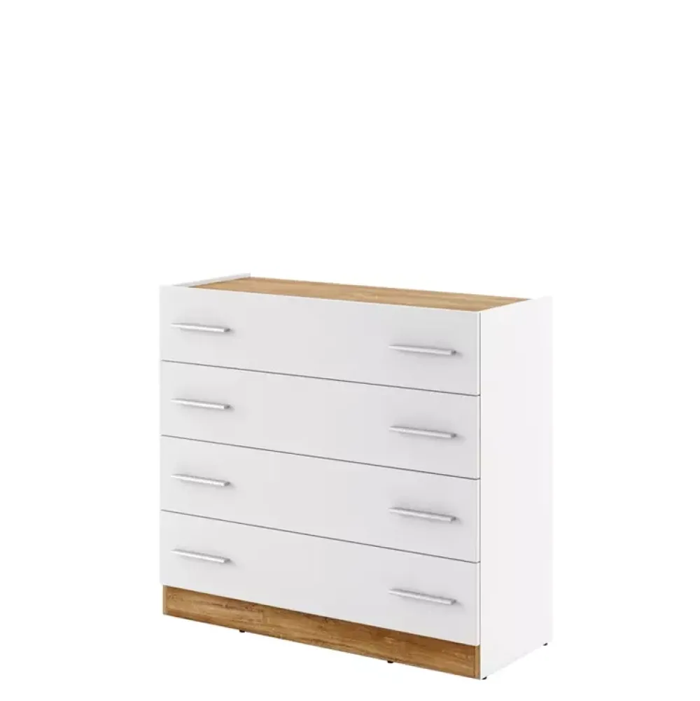 - Komoda z szufladami do sypialni DENTRO to propozycja wykonana w nowoczesnej stylistyce w połączeniu koloru bieli alpejskiej oraz dębu stirling. Komodę wyposażono w cztery pojemne szuflady osadzone na prowadnicach rolkowych.