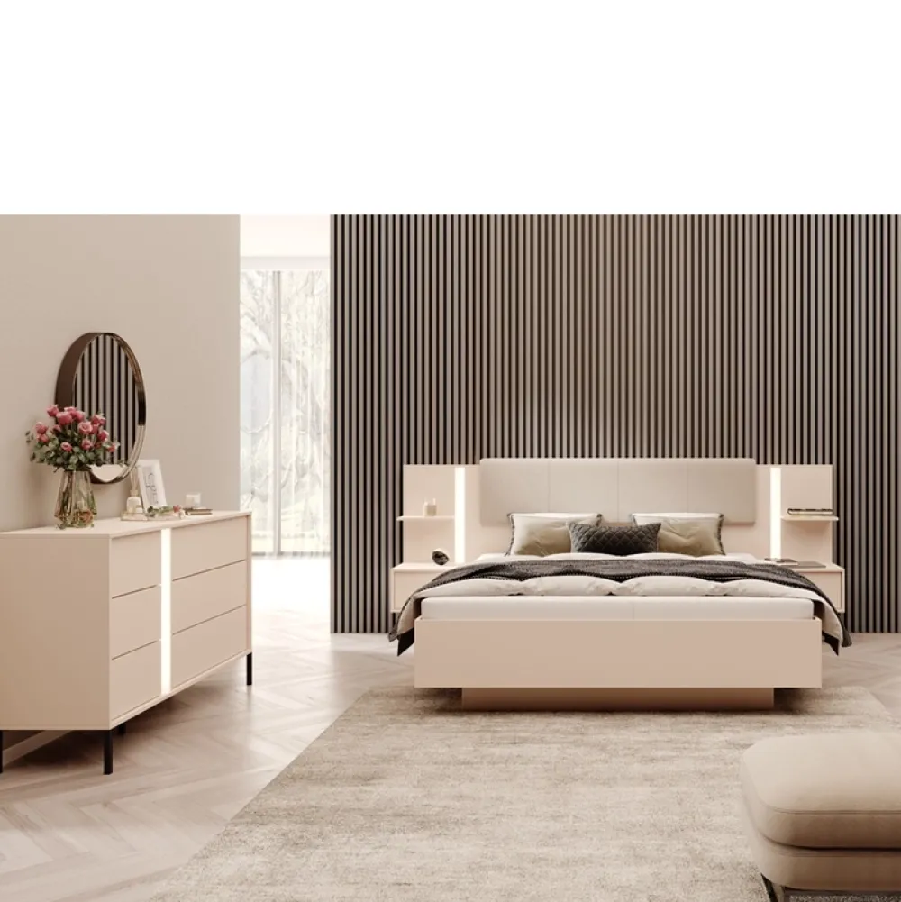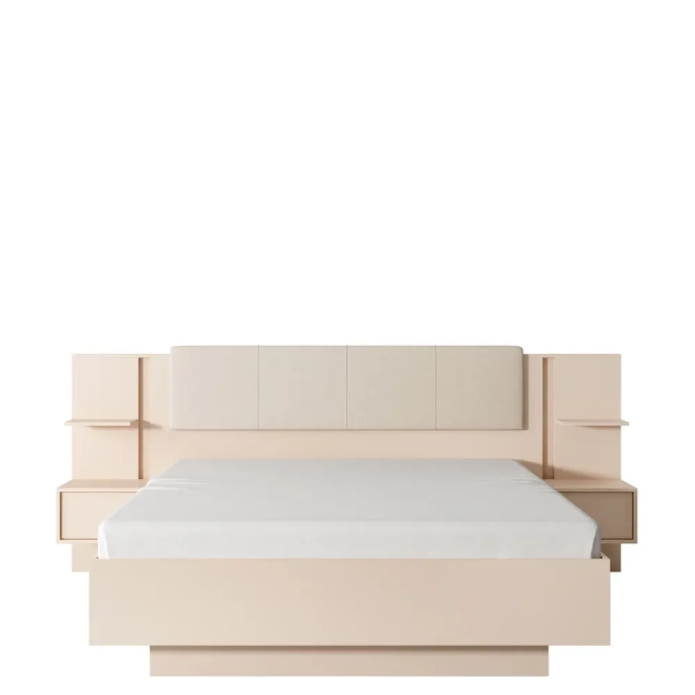 Łóżko: Głównym elementem zestawu jest łóżko, które zachwyca swym prostym, lecz wyrafinowanym wyglądem. Dwa stoliki nocne po bokach łóżka uzupełniają kompozycję, oferując wygodne miejsce na lampki nocne, książki czy inne drobiazgi.