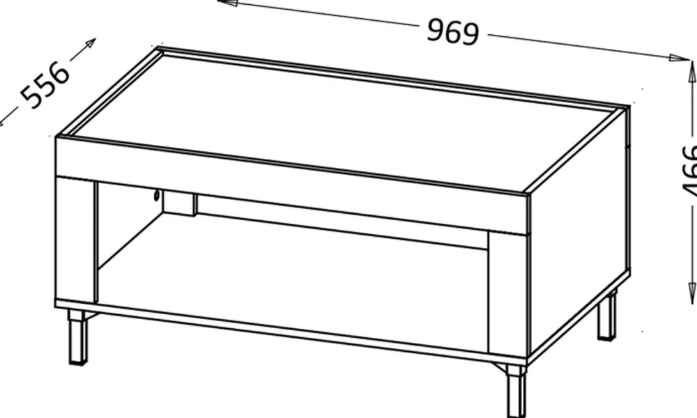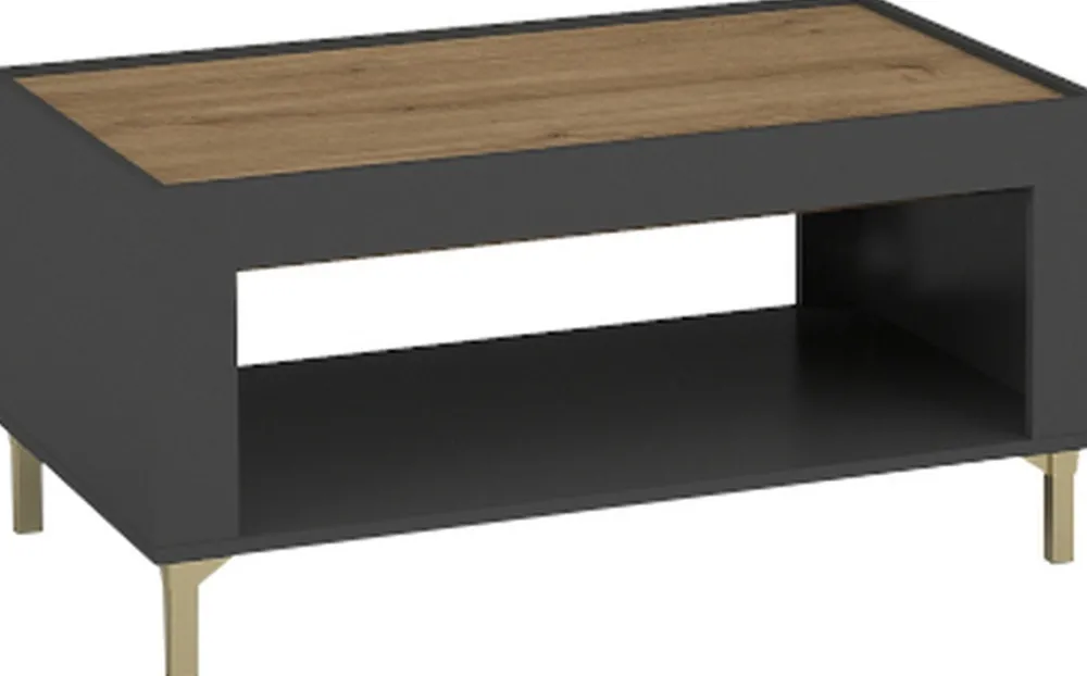 - Stolik kawowy do salonu MISTY posiada blat w kolorze dąb whisky, pod którym znajduje się wnęka z półką na pilot od telewizora oraz inne akcesoria. Stolik posiada nóżki o wysokości 12 cm, które pozwalają na swobodną pracę odkurzaczy samojezdnych.