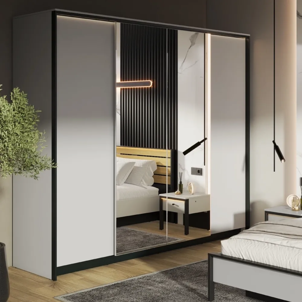 - Czterodrzwiowa szafa do sypialni o szerokości 250 cm GRIS. Wyposażona jest w aż 12 półek, 2 drążki na ubrania oraz oświetlenie LED. Szafa do sypialni posiada dwoje drzwi z lustrem. Wykonana została z płyty laminowanej 16 mm. Drzwi z cichym domykiem.