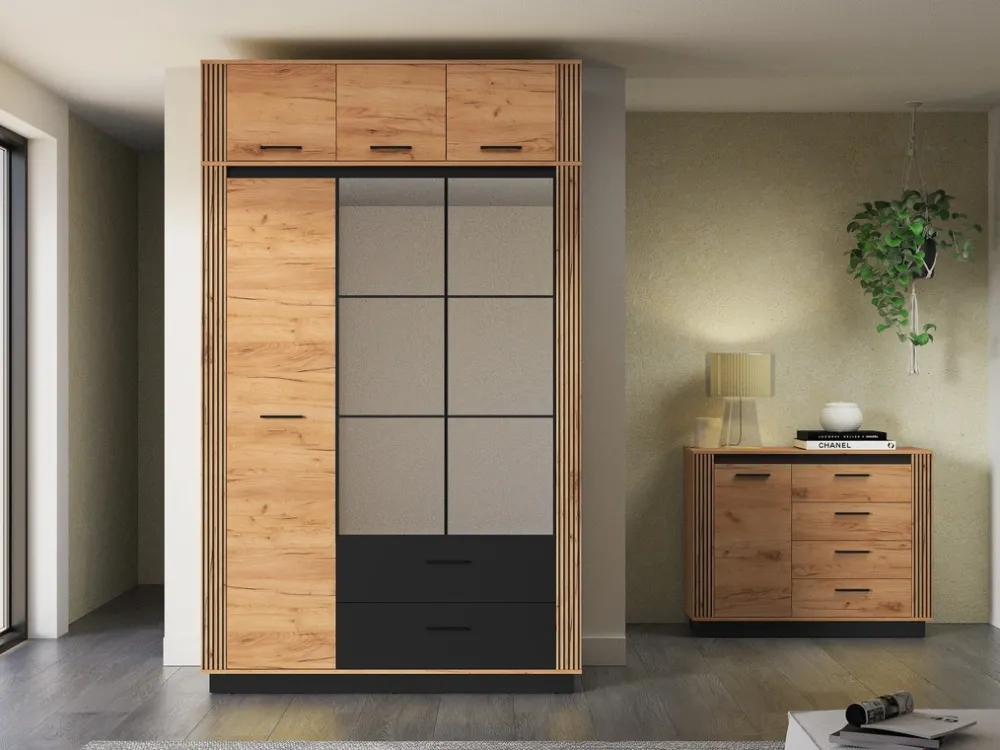 Nadstawka UMIO to sprytne rozwiązanie dla tych, którzy chcą maksymalnie wykorzystać przestrzeń w sypialni lub garderobie. Trzydrzwiowa konstrukcja oferuje dodatkowe miejsce do przechowywania, idealne na rzadziej używane przedmioty, sezonowe ubrania czy zapasową pościel – bez potrzeby zajmowania dodatkowej powierzchni w pomieszczeniu.