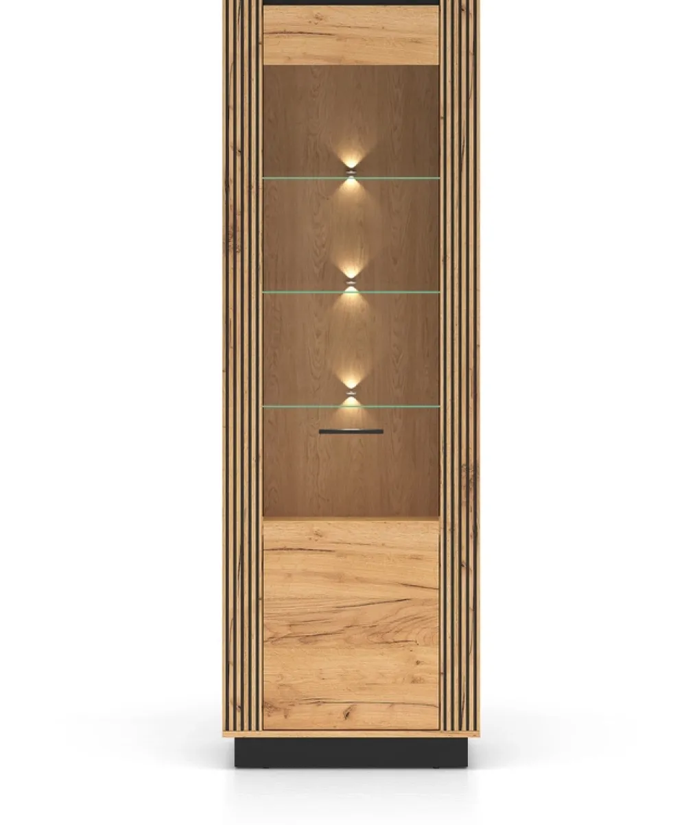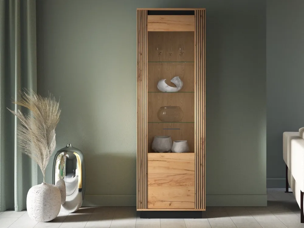 Witryna loftowa UMIO w kolorze dąb craft złoty z czarnymi akcentami to idealny wybór dla miłośników nowoczesnych, industrialnych wnętrz. Dzięki przeszklonym drzwiom i subtelnym lamelom eksponuje dekoracje z klasą, jednocześnie oferując praktyczne miejsce do przechowywania. To połączenie stylu, solidności i komfortu codziennego użytkowania.