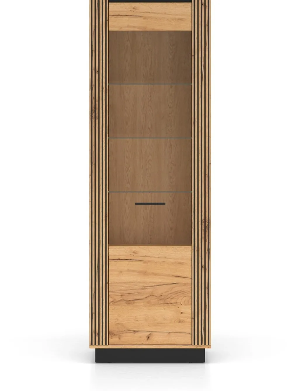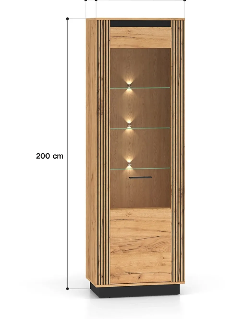- Witryna 1-drzwiowa w kolorze dąb craft złoty z czarnymi detalami i przeszklonym frontem. Wyposażona w trzy szklane półki, dwie półki z płyty oraz system cichego domyku. Opcjonalne oświetlenie LED dodaje elegancji. Idealna do salonu lub jadalni.