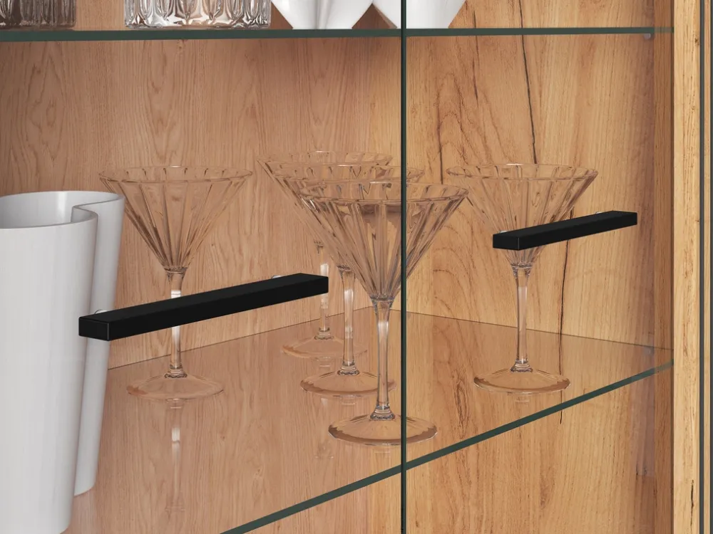 Precyzyjne wykończenie, czarne uchwyty i delikatne, nowoczesne linie sprawiają, że mebel wpisuje się w aktualne trendy wnętrzarskie. Możliwość doboru oświetlenia LED pozwala dodatkowo podkreślić wyjątkowy charakter ekspozycji – od porcelany po kolekcję szkła czy drobne dzieła sztuki.